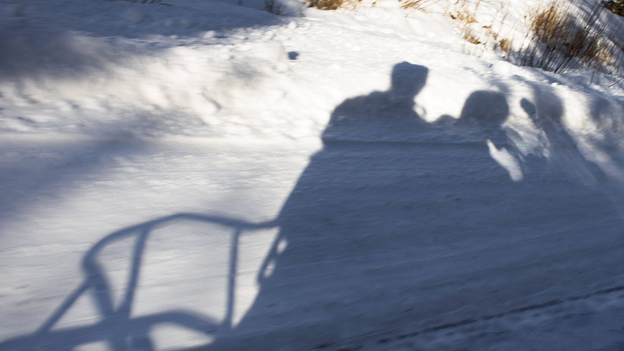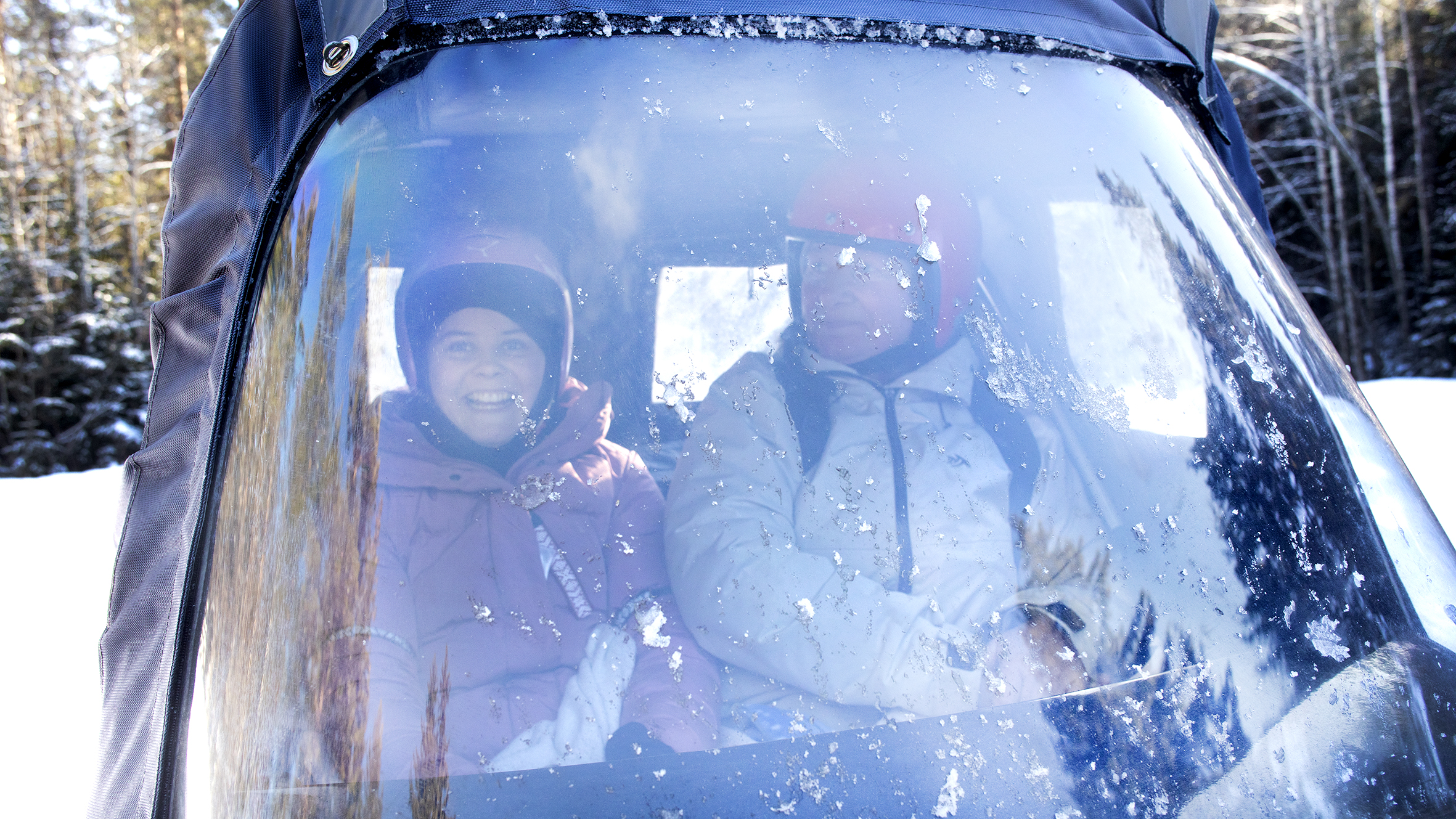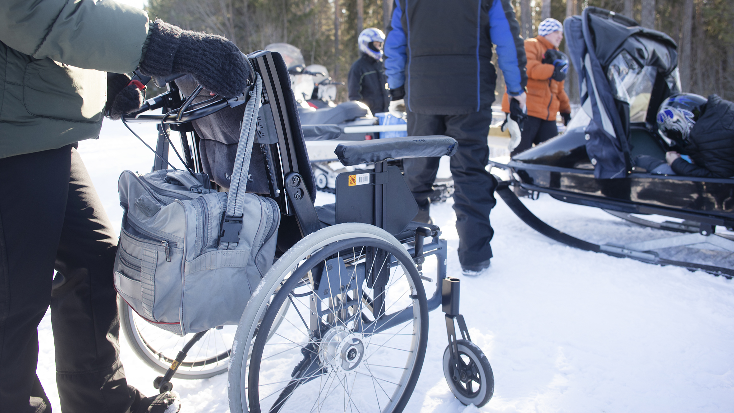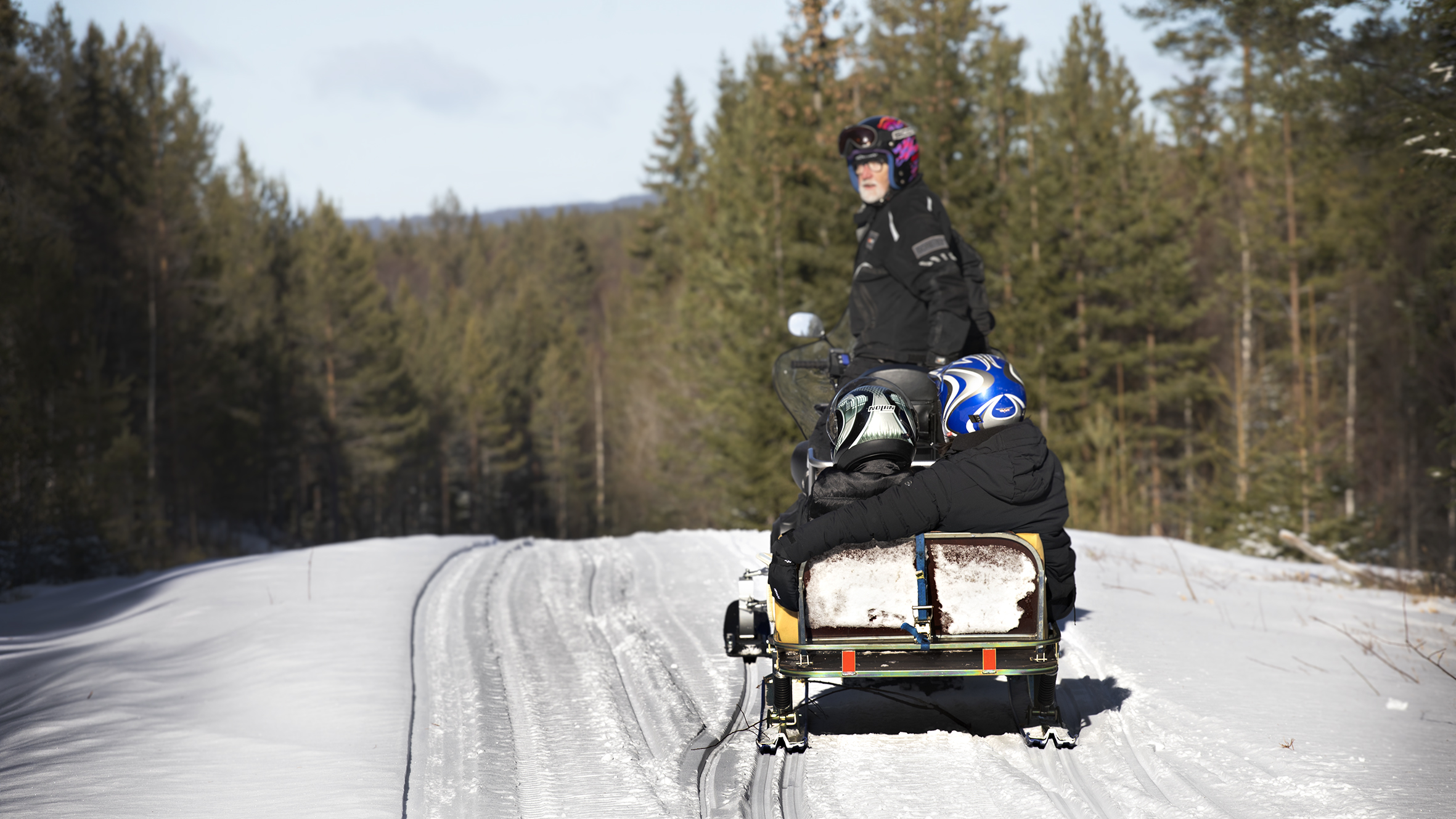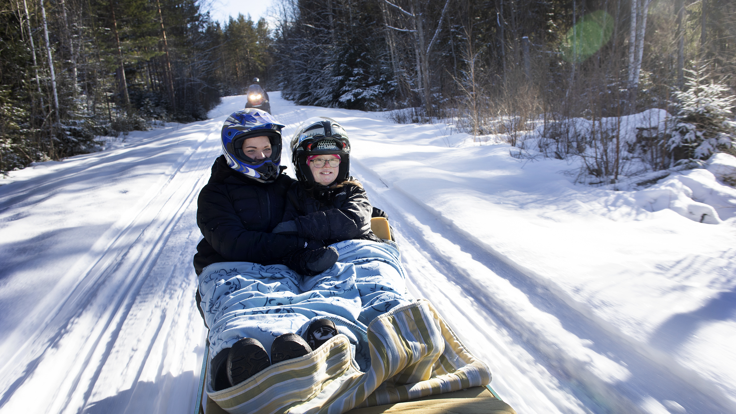 Sju kilometer rakt upp på skogskullen och sen ner genom kurviga skogsstigar. En som inte sitter hemma och mumsar på farmor Brittas småkakor en sån här lördag är Camilla Sanfer. Tillsammans med boendestödjaren My Martinsson sätter hon sig i madrasserad kälke bakom Egon Nymans Yamaha. De drar upp fleecefilten och så bär det av upp längs skogsvägen.