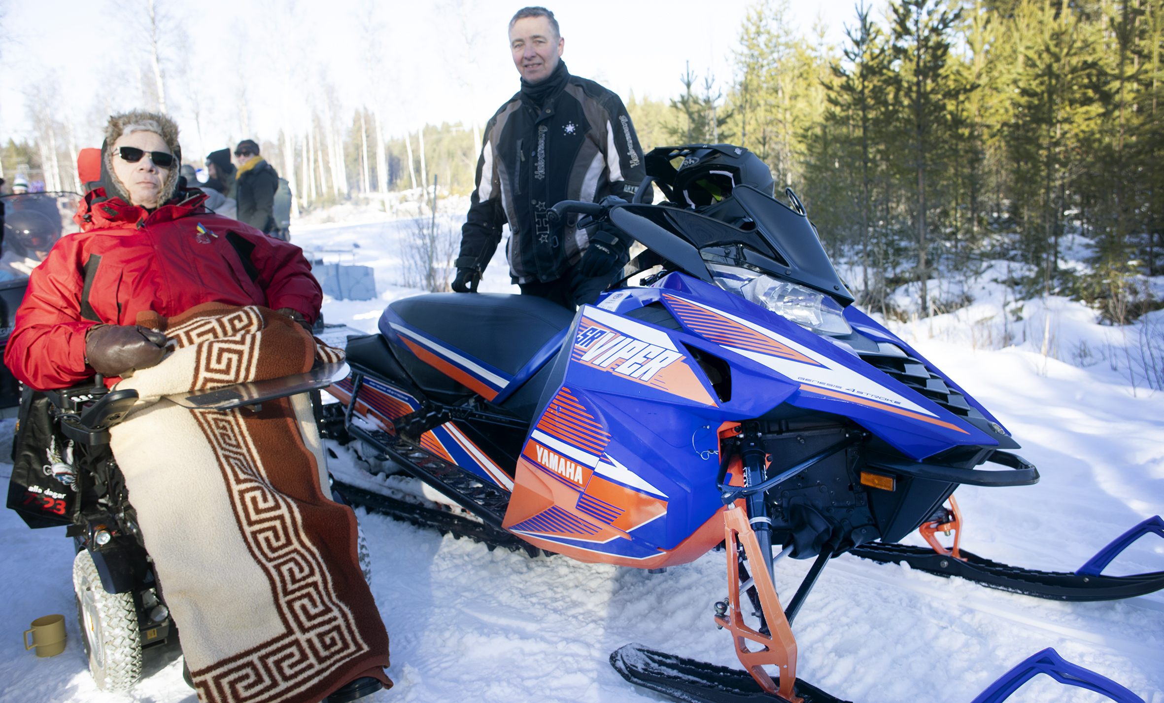 I sin elrullstol kör Magnus Kindåker från Falun fram till skoterförare Leif Karlsson och hans racerskoter. Det här är en duo som har åkt skoter ihop många gånger genom åren.