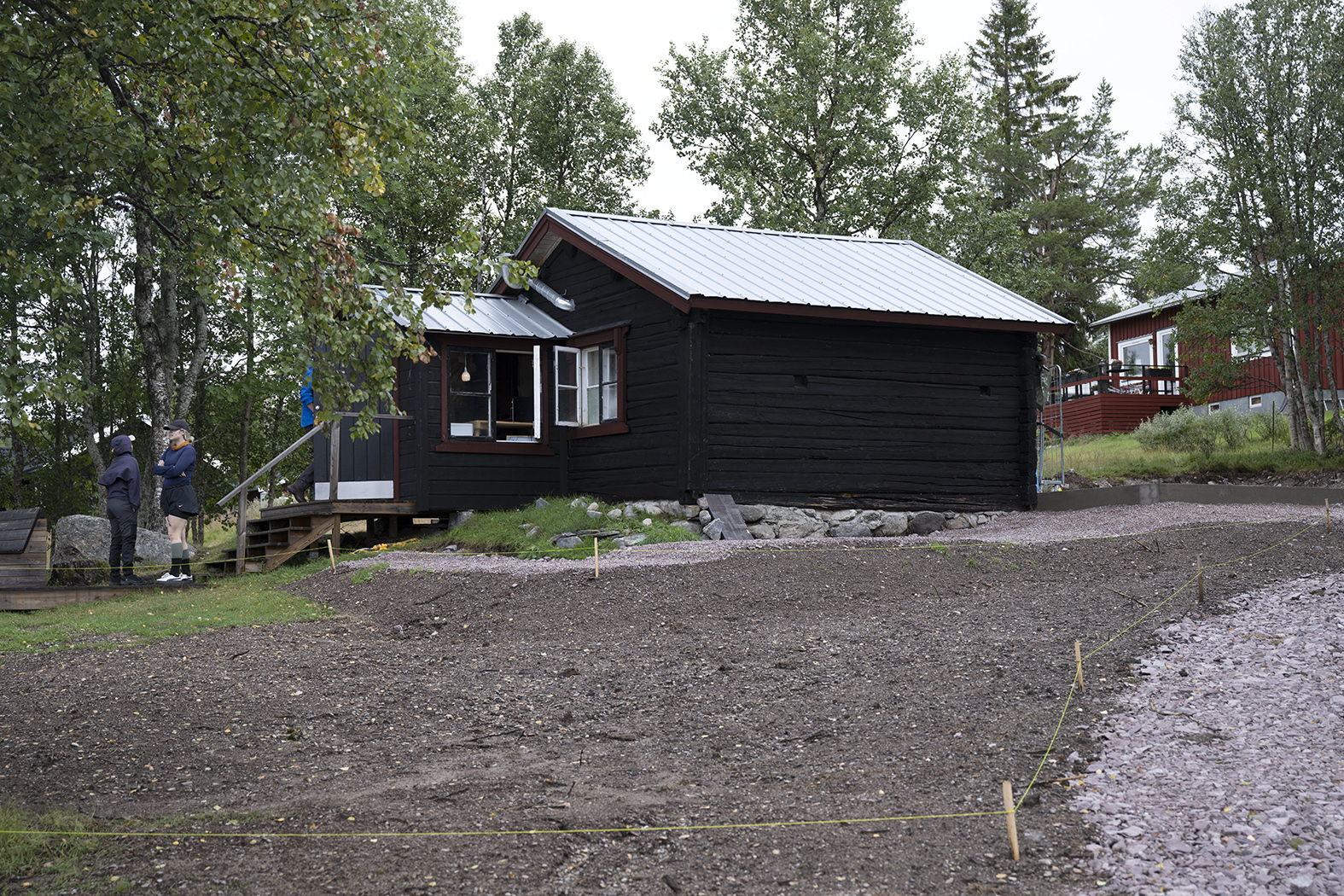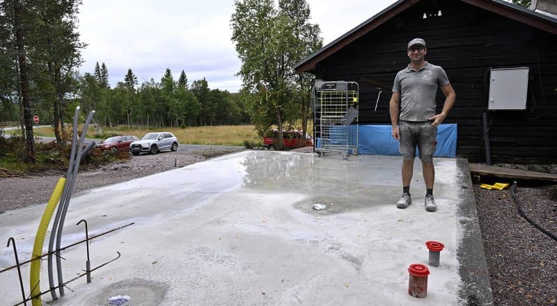 Nu har det gått fem år och fäbodstugan står kvar, men bakom den har Maxime nu gjutit en 30 kvadratmeter stor platta.