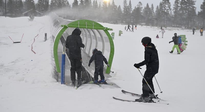 På Idre Himmelfjäll kunde fyra liftar vara öppna och det var något som en hel del passade på att utnyttja. Inte minst barnområdets tunnelöverbyggda rullband bjöd på skön lä från vinden under färden upp.