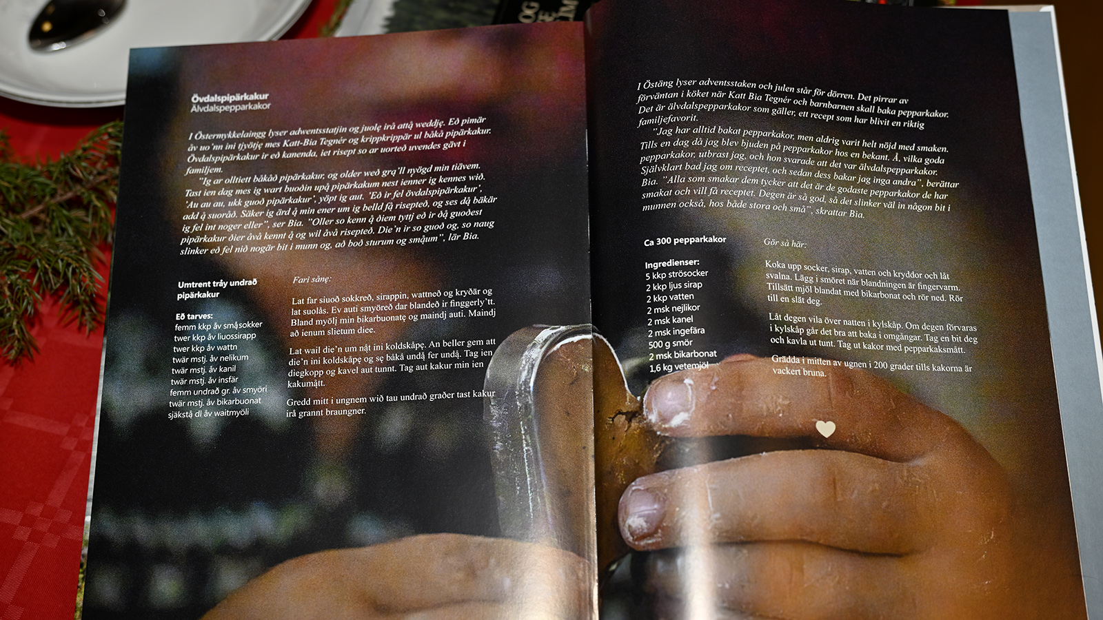 — Boken inleds med frukosträtter som olika gröt- och vällingrätter och lite enklare rätter. Det följs sedan av kapitel med brödbak, kött- och fiskrätter och så olika modernare rätter och desserter, förklarar Tyra och plockar fram sidorna med Övdalspipärkakur.