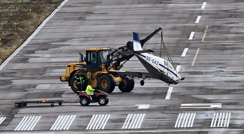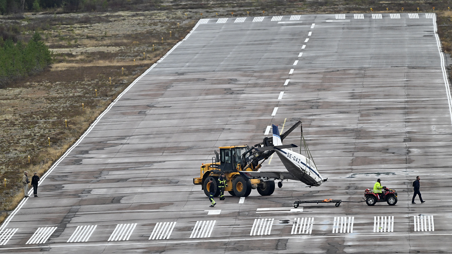 — I samband med skolning för behörighet har det gjorts ett antal start och landning där det handlade att omkonfigurera flygplanet till studs och gå i samband med landning. Vid det här tillfället girade flygplanet vänster och lämnade banan ut i naturen. Flygplanet är allvarligt skadat och höger vinge har ryckts av. Planet blev stående på nosen i 45 graders vinkel. Piloten kunde stänga av maskinen och vi vet inte anledningen och orsaken till vad som hände.