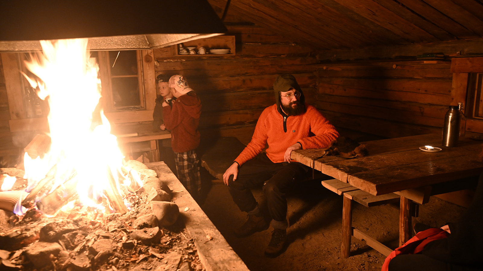 Inne i en av kojorna sitter Samuel Lundström, håller elden i gång. Påminnande om hur det var i kojorna för skogshuggarna från till mitten av förra århundradet. I en annan koja gräddas det kolbotten,
