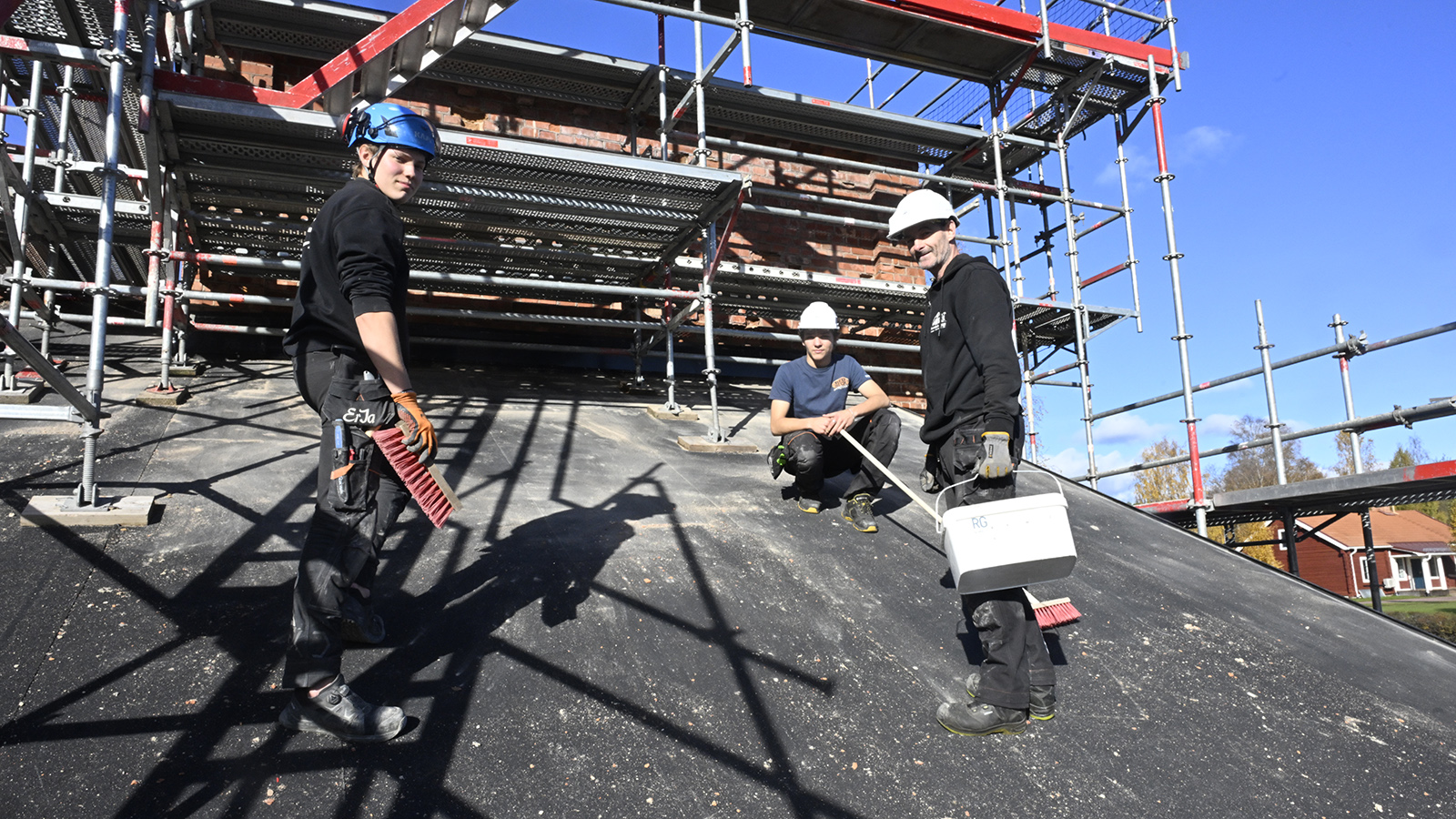 Magnus Wallin och Gustav Hed jobbar åt PW Plåt och plockar ihop sina grejor efter att de plåtarbeten som berör taket är klara.