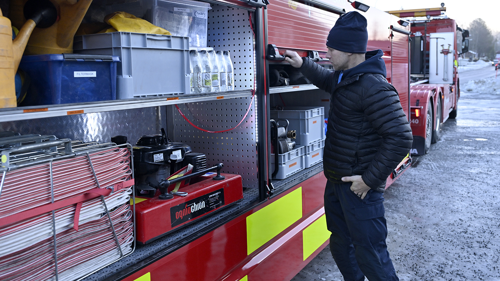— Den är också längre än de övriga bilarna, men den är välkommen, säger Svante Månsson, som är en av insatsledarna och den som utbildades på den nya brandbilen med uppdraget att lära upp övriga brandmän i Idre hur den stora bilen fungerar.