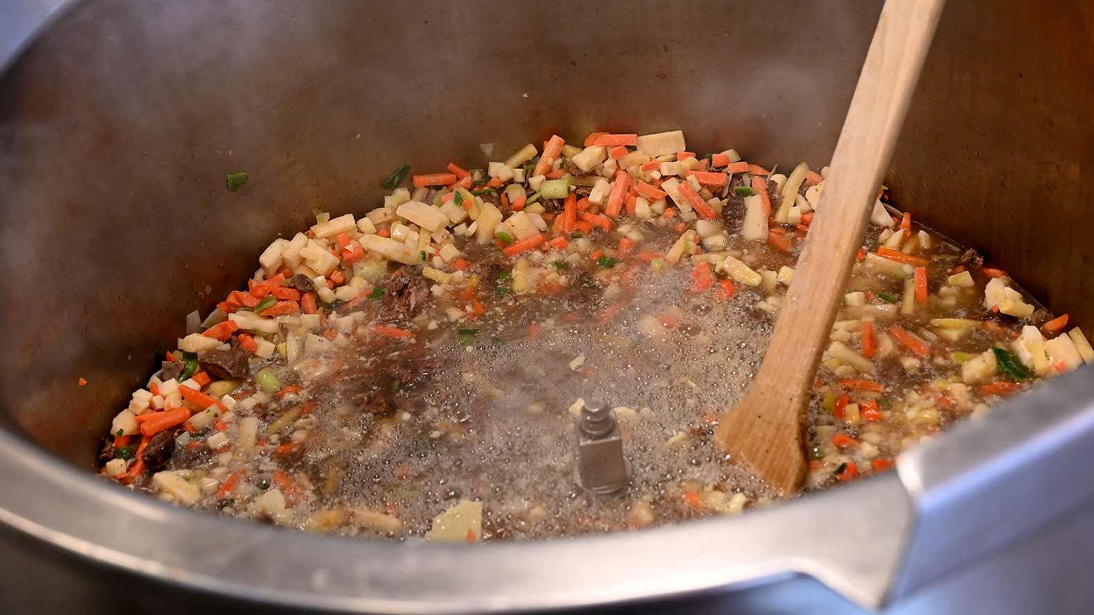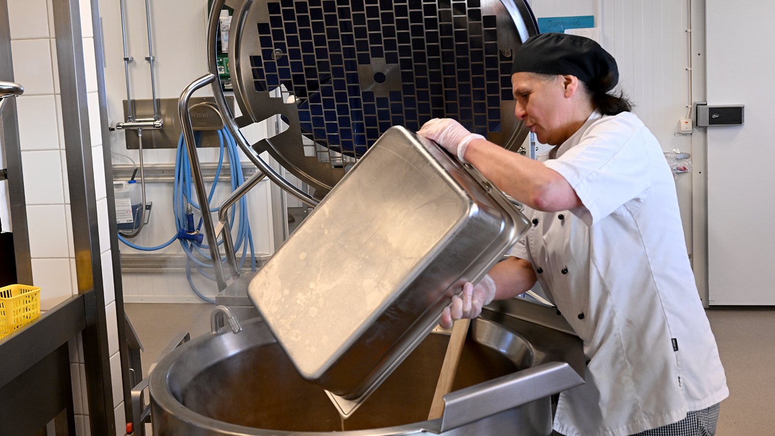 — Det blir renköttssoppa, säger Martina Hedberg och häller i renköttet i den stora grytan.