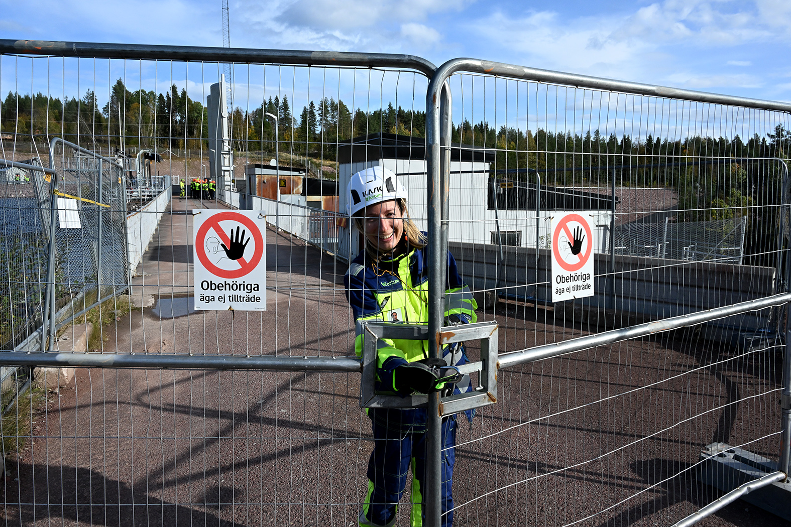 Fiskvägsbygget vid dammarna över Österdalälven är stängda så länge arbetet pågår. Här låser Sofia Steinbock, Fortum tillfälligt upp grindarna i samband med invigningen av fiskvägarna i Spjutmo 2023. Foto Nisse Schmidt