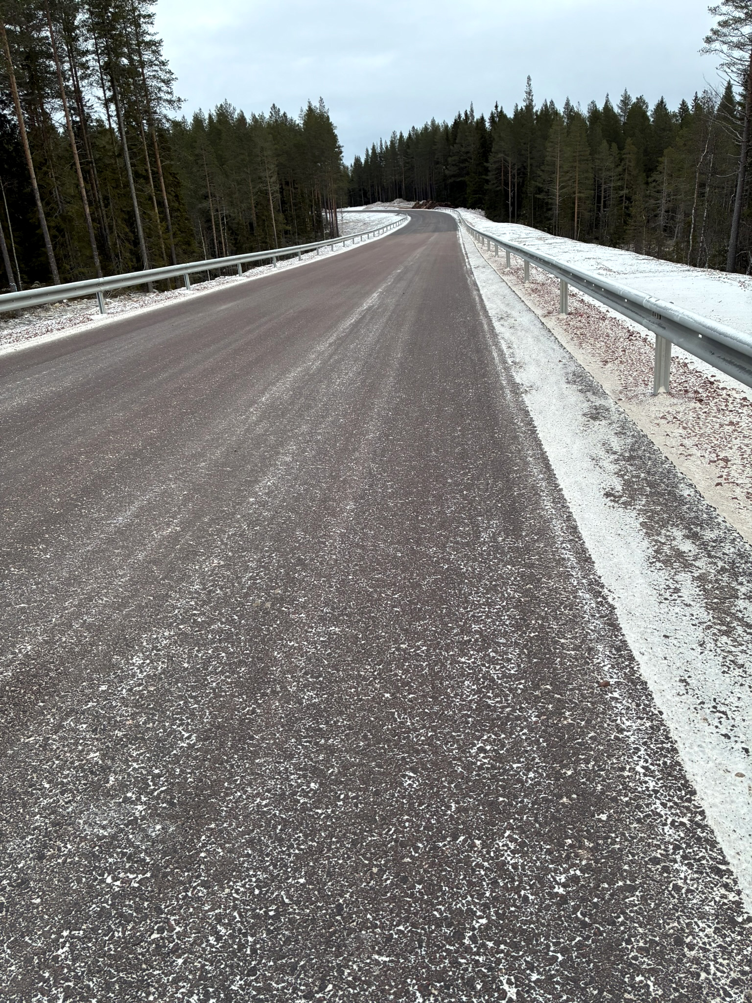 Under hösten har hela vägens konstruktion byggts upp i flera steg: undre förstärkningslager, förstärkningslager, bärlager och ett slitstarkt lager av asfaltsgrus. Kant- och mittlinjer har mätts in och omfattande materialtransporter har hanterats. Inför vintern har räcken och snökäppar monterats samt ytterligare säkerhetsåtgärder genomförts.