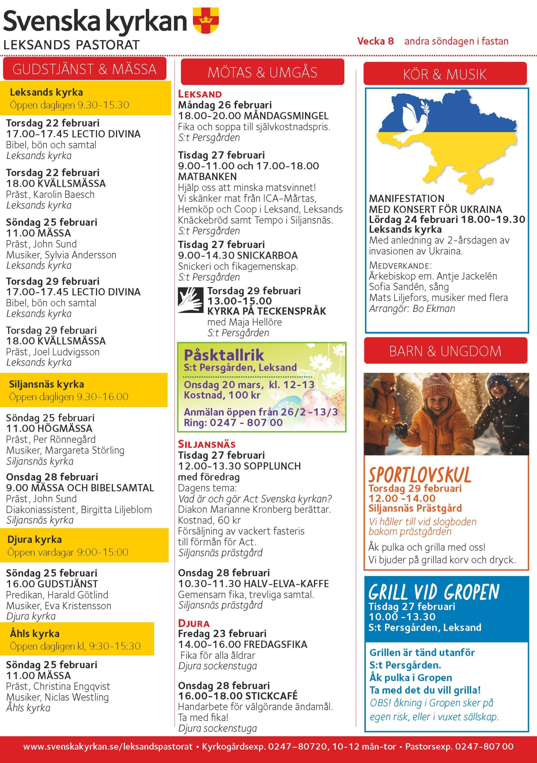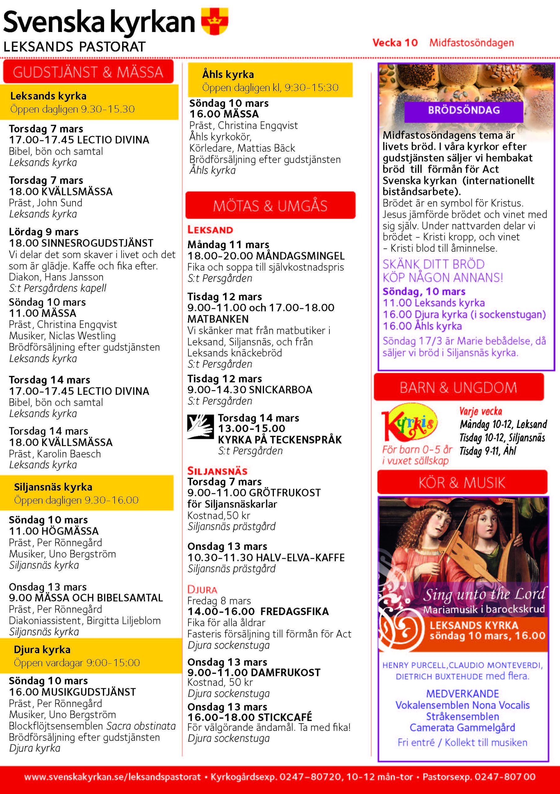 Här kan du hålla dig uppdaterad på vad som händer i våra kyrkor i Leksand, Djura, Siljansnäs och Åhl och verksamheterna i församlingshemmen. Har du detaljfrågor är du välkommen att ringa till Pastorsexpeditionen på 0247-807 00.