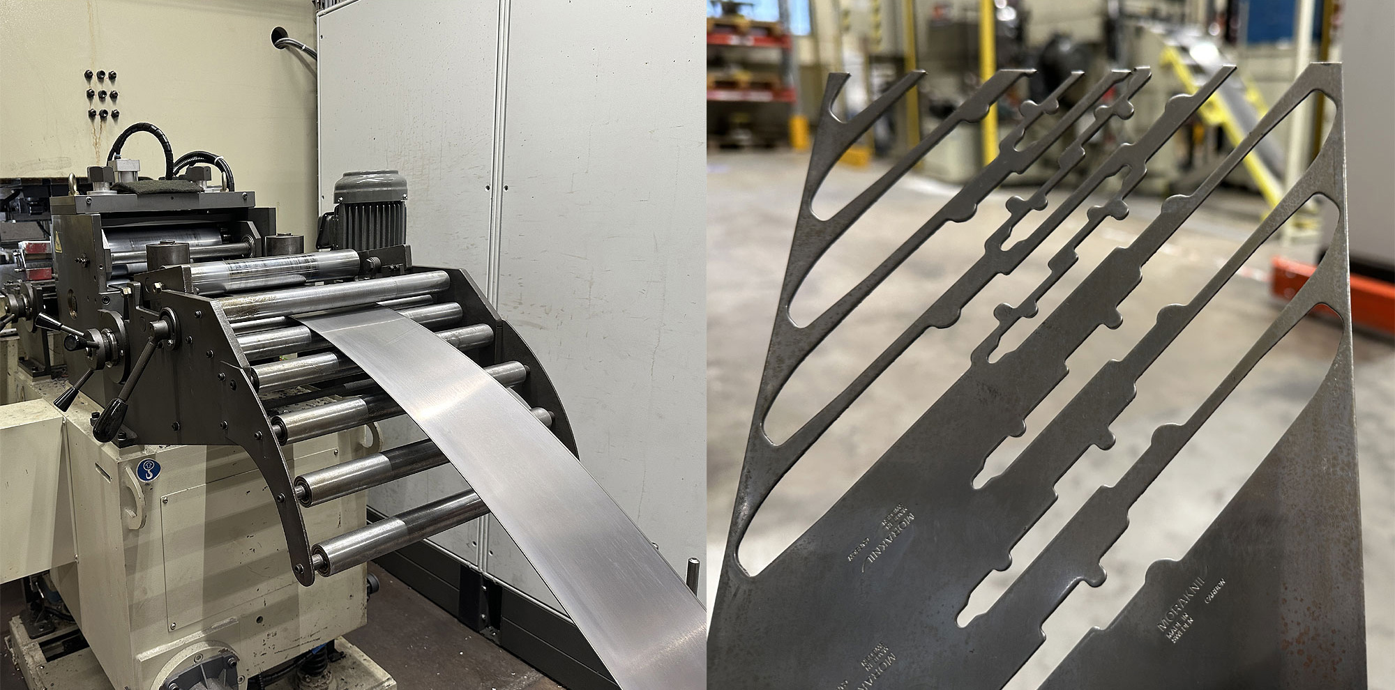 I hjärtat av Östnor, Mora, arbetar stansningsmaskinen med kraftfull precision – en viktig del i Moraknivs moderna produktion. De färdigstansade bladen transporteras smidigt vidare på ett band, innan de samlas för nästa steg i tillverkningen.