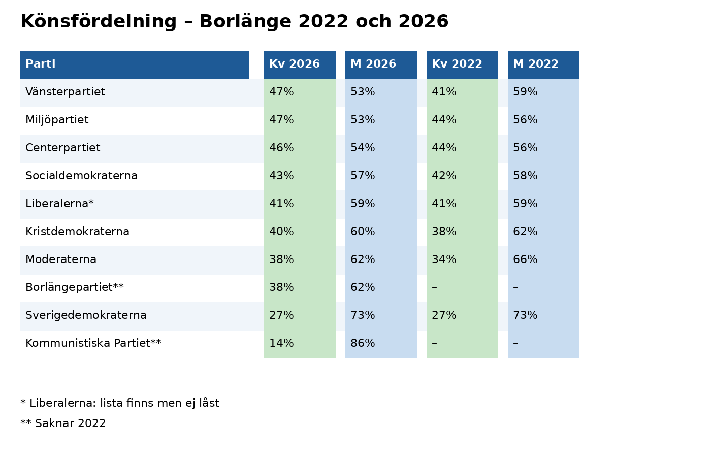 Tabellen visar andelen kvinnor och män på partiernas listor i valen 2026 och 2022.