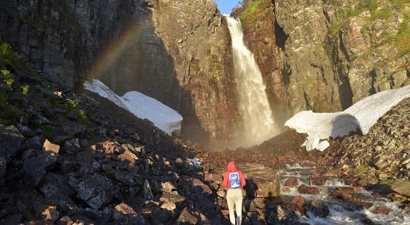 Men med ett litet undantag. Just nu under två veckor runt sommarsolståndet når solstrålarna in i klyften och skapar magiskt ljus och regnbågar bildas i luften av vattendropparna i luften från det 93 meter höga fallet, varav 70 meter i fritt fall. Inte högst i Sverige, Greven och Grevinnan vid Stora Sjöfallet är högre, men inte vad gäller fritt fall.