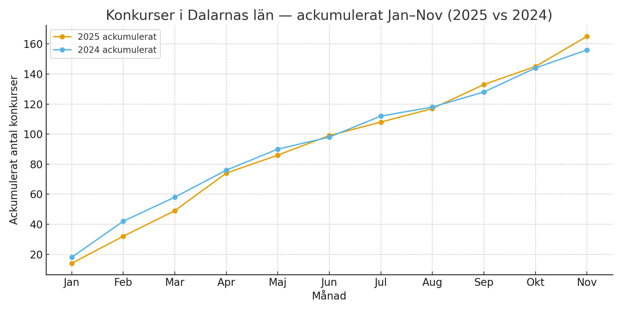 Under januari–november 2025 har 165 företag gått i konkurs i Dalarna, jämfört med 156 samma period 2024. Den kraftiga ökningen märktes i november då 20 företag gick i konkurs, mot 12 under samma månad 2024 – en ökning på 67 procent.