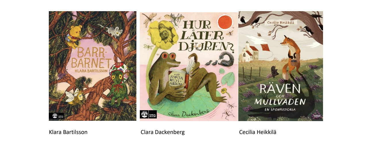 De som är nominerade av juryn är tre framstående barnboksillustratörer, Klara Gartilsson med, Barrbarnet. Clara Dackenberg med, Hur låter djuren och Cecilia Heikkilä med, Räven och mullvaden.