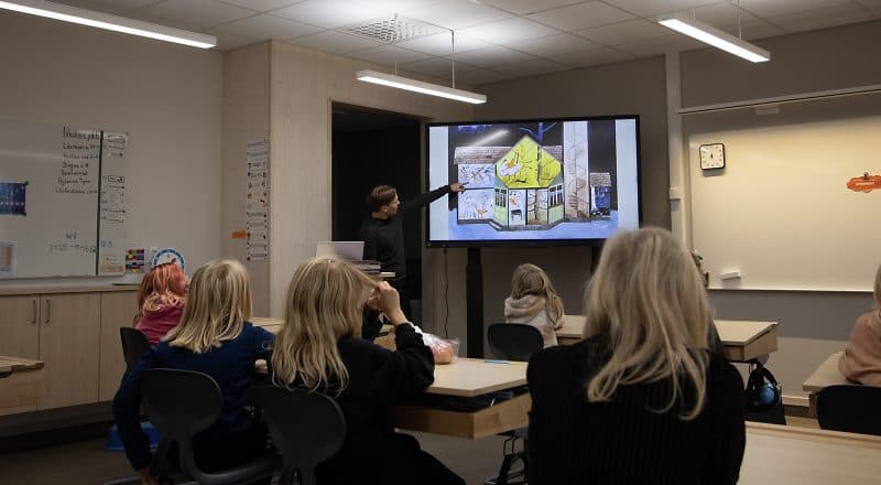 Under presentationen på Djuråsskolan visar Kristofer bilder och bjuder in till diskussion om vad eleverna ser i bilderna. En av illustrationerna är från Barrbarnet.