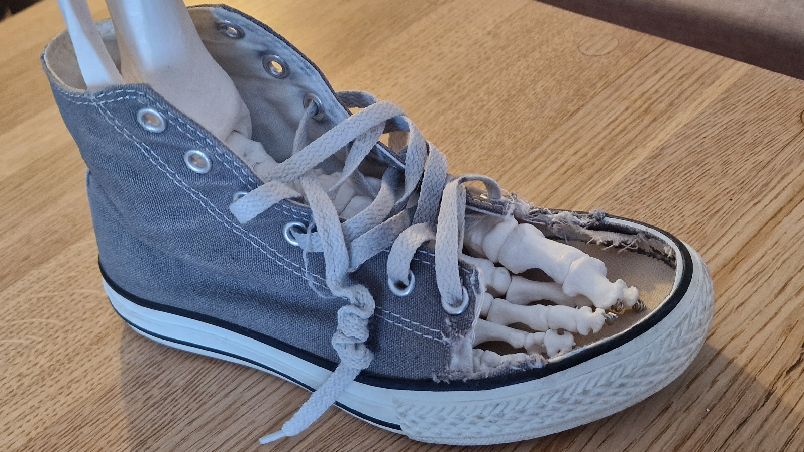 För att illustrera det hela tar hon fram en sko som man har öppnat upp och satt ned ett skelett av en fot.