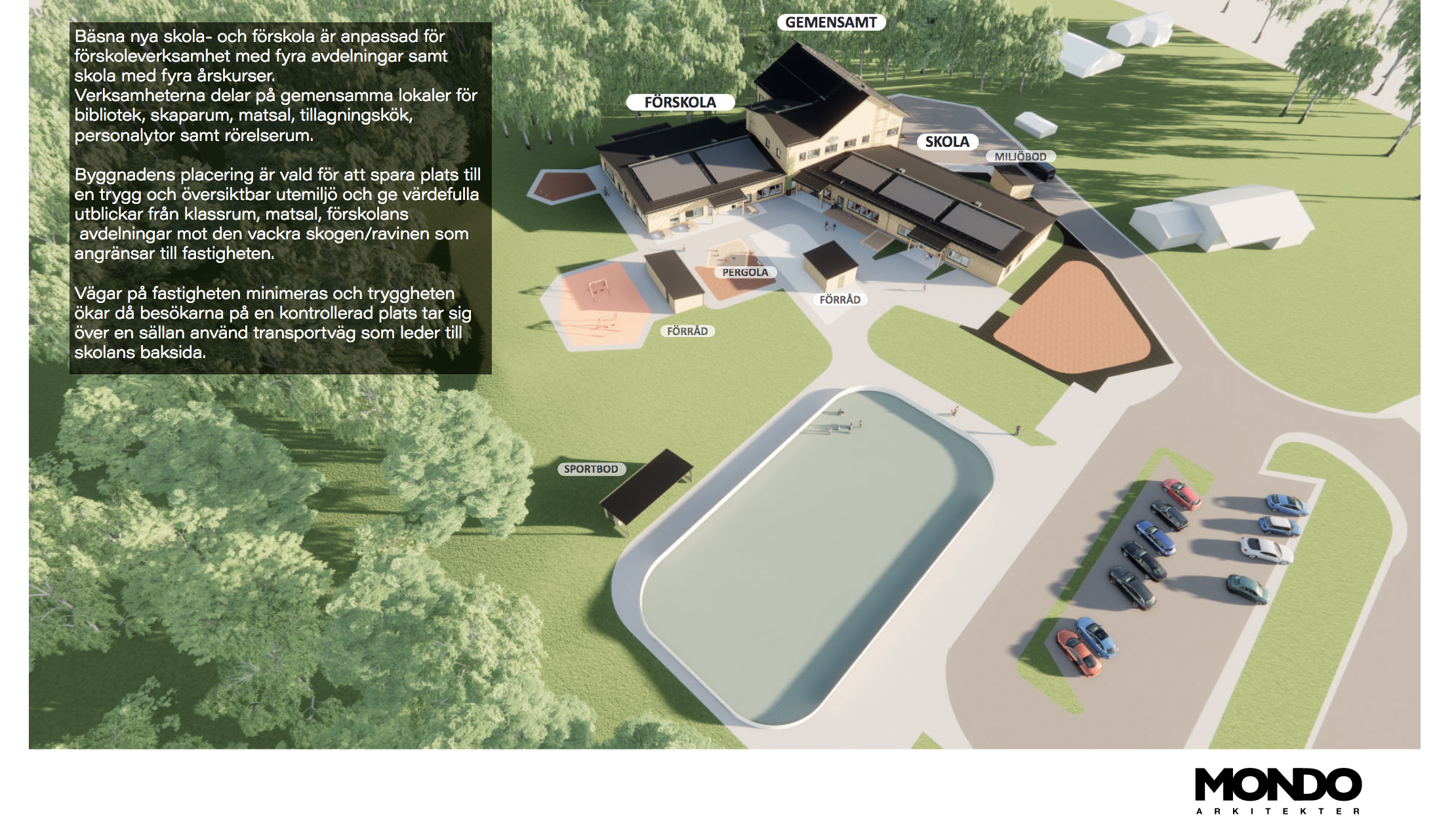 Bäsnaskolans nuvarande skola och förskola rivs och ersätts av en ny byggnad för förskola med fyra avdelningar och elever i årskurs F-3 samt tillagningskök. I Kyrkskolan föreslås åtgärder för att förbättra arbetsmiljön och vidare projektering för en eventuell om- och tillbyggnad.