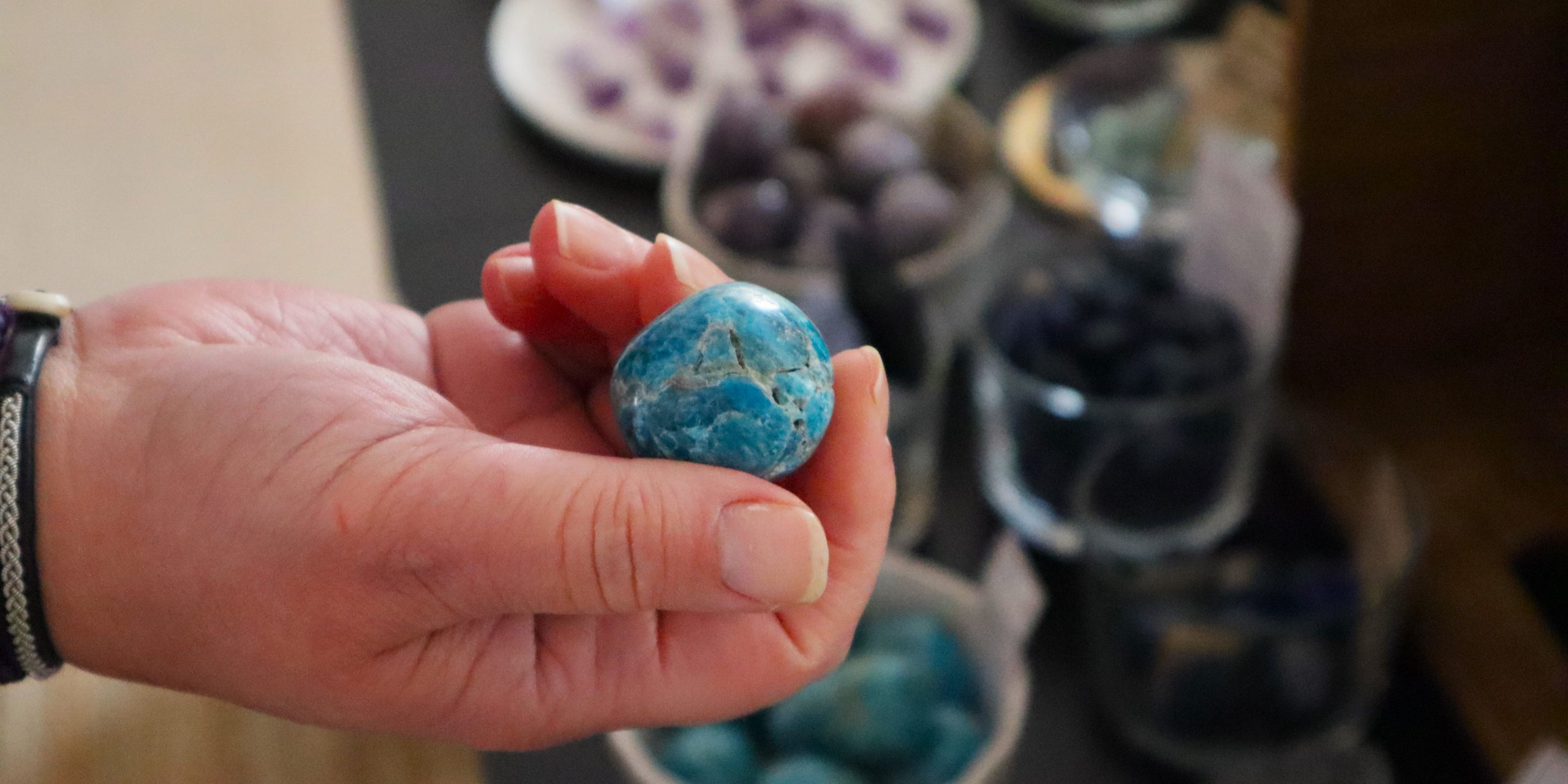 Det doftar gott av rökelser i rummet och på hyllorna ligger kristallerna uppradade. Det är en salig blandning av färger och former. Bergskristaller, ametister och rosenkvarts samsas med buddhafigurer och smycken. Varje sten har en inneboende kraft som kan hjälpa till med olika svårigheter i livet. Ametisten kan hjälpa mot stress, förklarar Johanna. Och syftet med kristallerna är inte att mota bort demoner, utan att använda dem för harmoni och välmående.