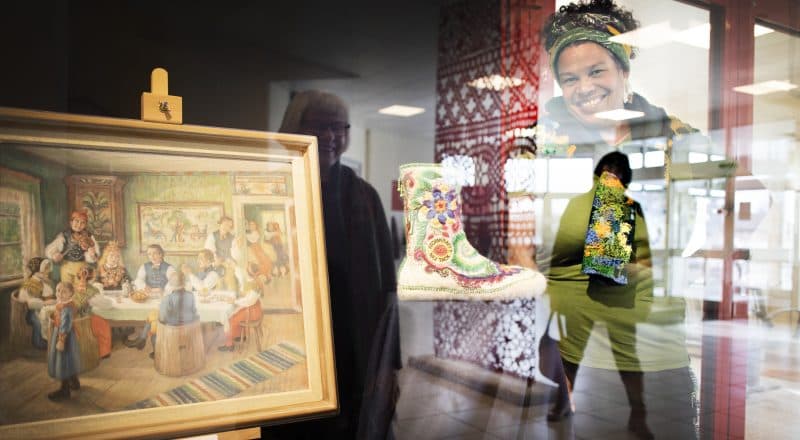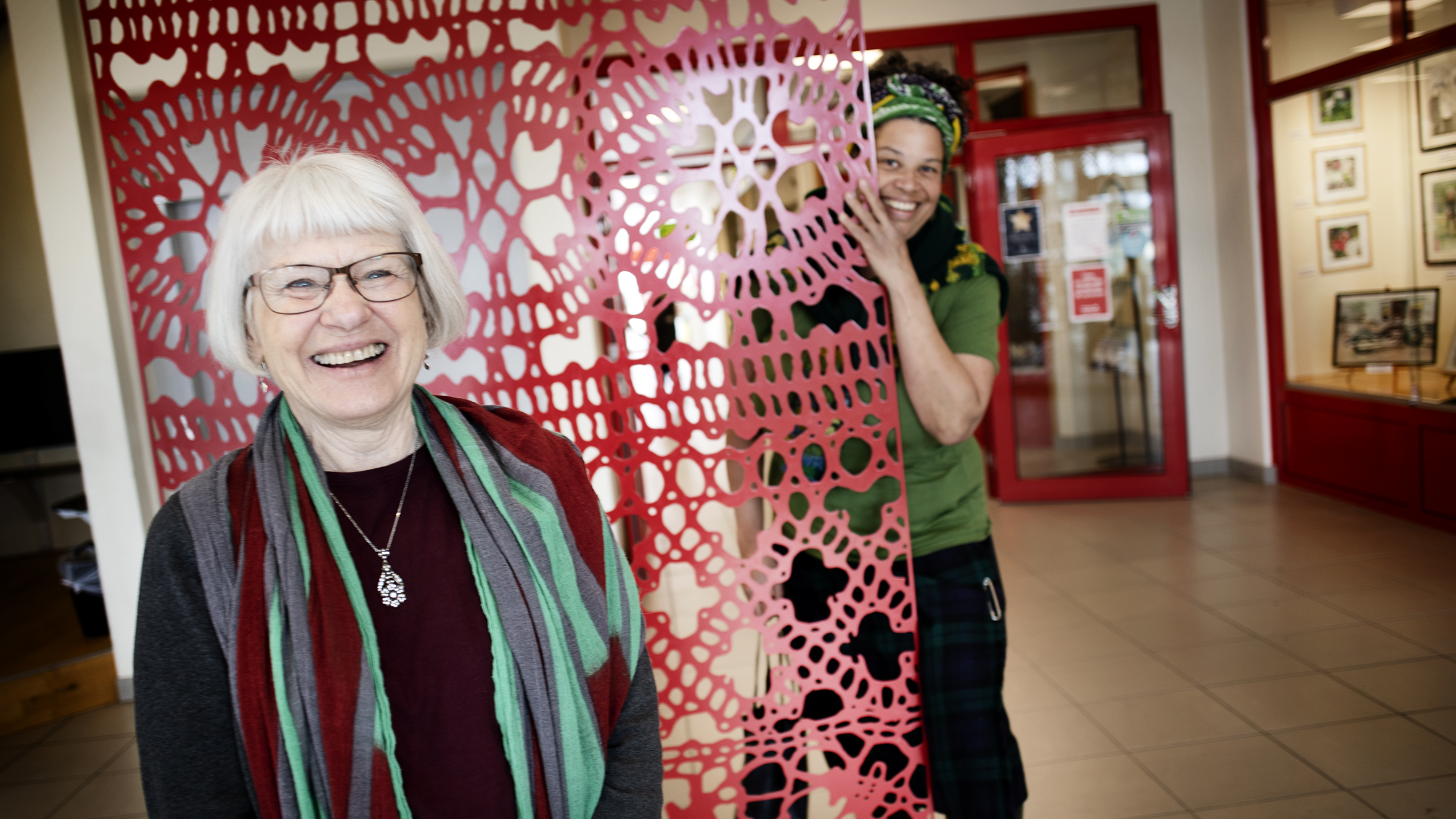 Spindeln i konstnätverket tillika vävaren Susanne Naula och multikonstnären Lotta-Maja Öhman tar emot i entrén till Lindberghallen. De berättar om utställningen och att resten av konsten finns att se på deras webbplats. Där kan man även läsa om de lokala konstnärerna.
