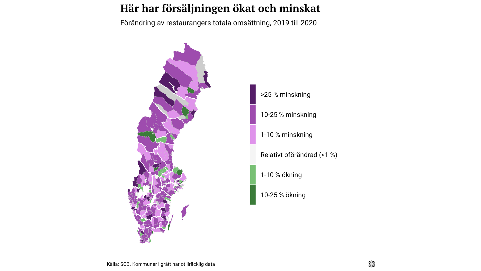 I elva av de femton dalakommuner har restaurangernas omsättningen sjunkit. Enligt SCB har uppgick Dalarnas restaurangers totala försäljning förra året till ungefär 2,5 miljarder kronor. Det är en minskning med 440,9 miljoner kronor jämfört med 2019.