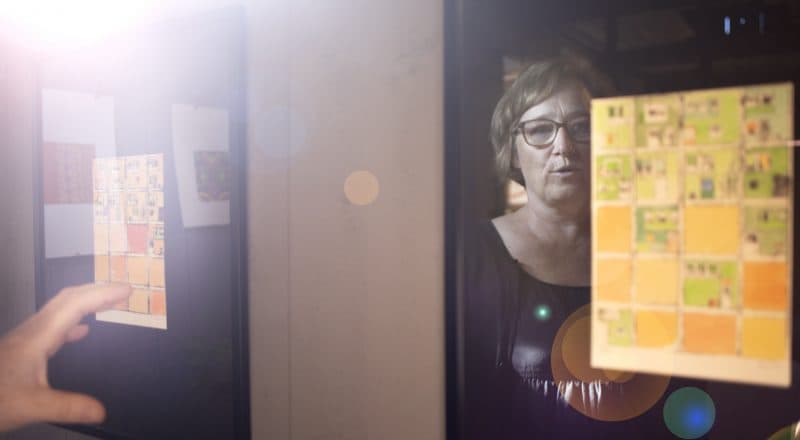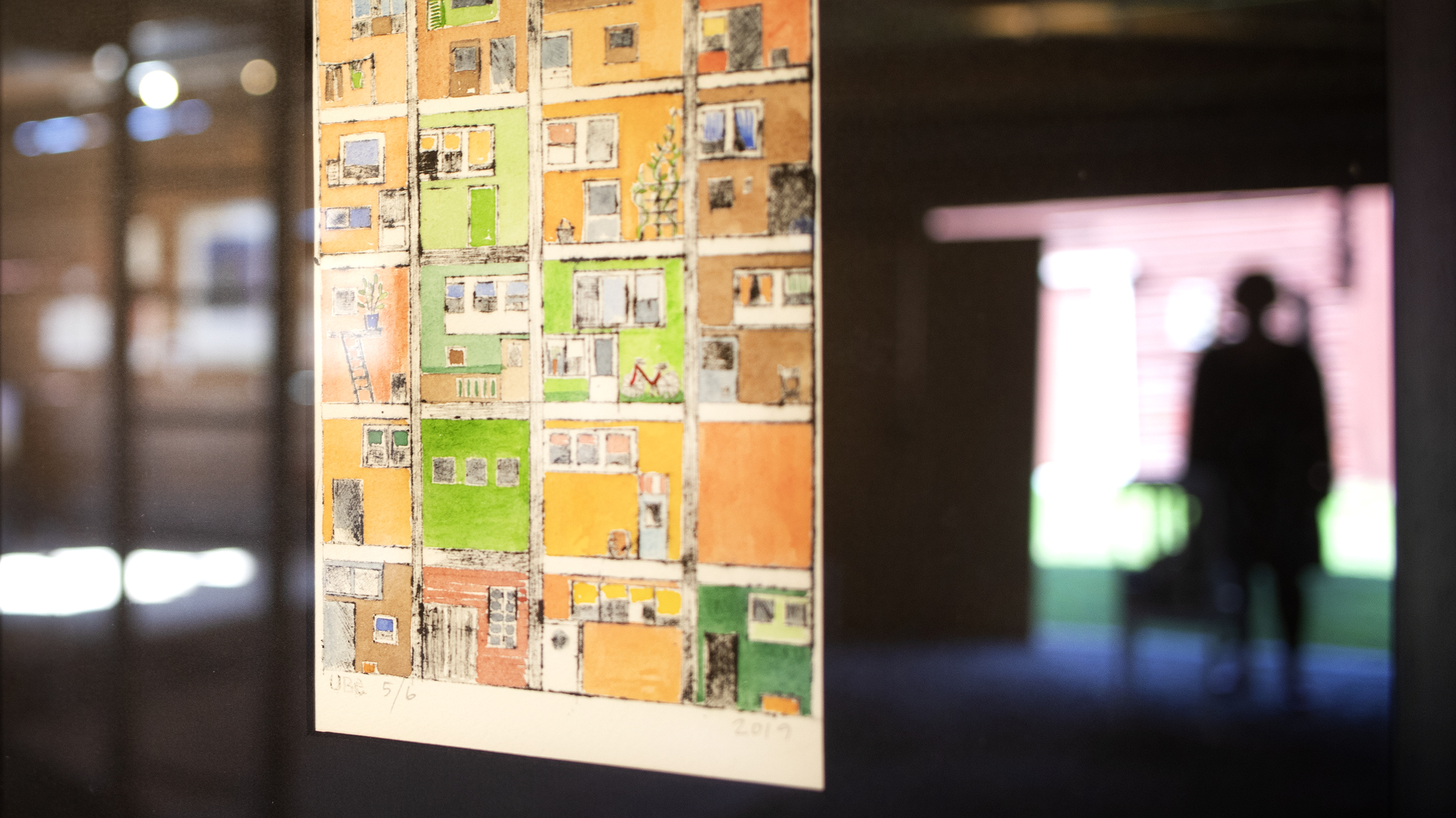 Hon visar runt i utställningshallen och stannar lite extra vid en inramad serie med kopparstickkonst som hon döpt till Grannar.