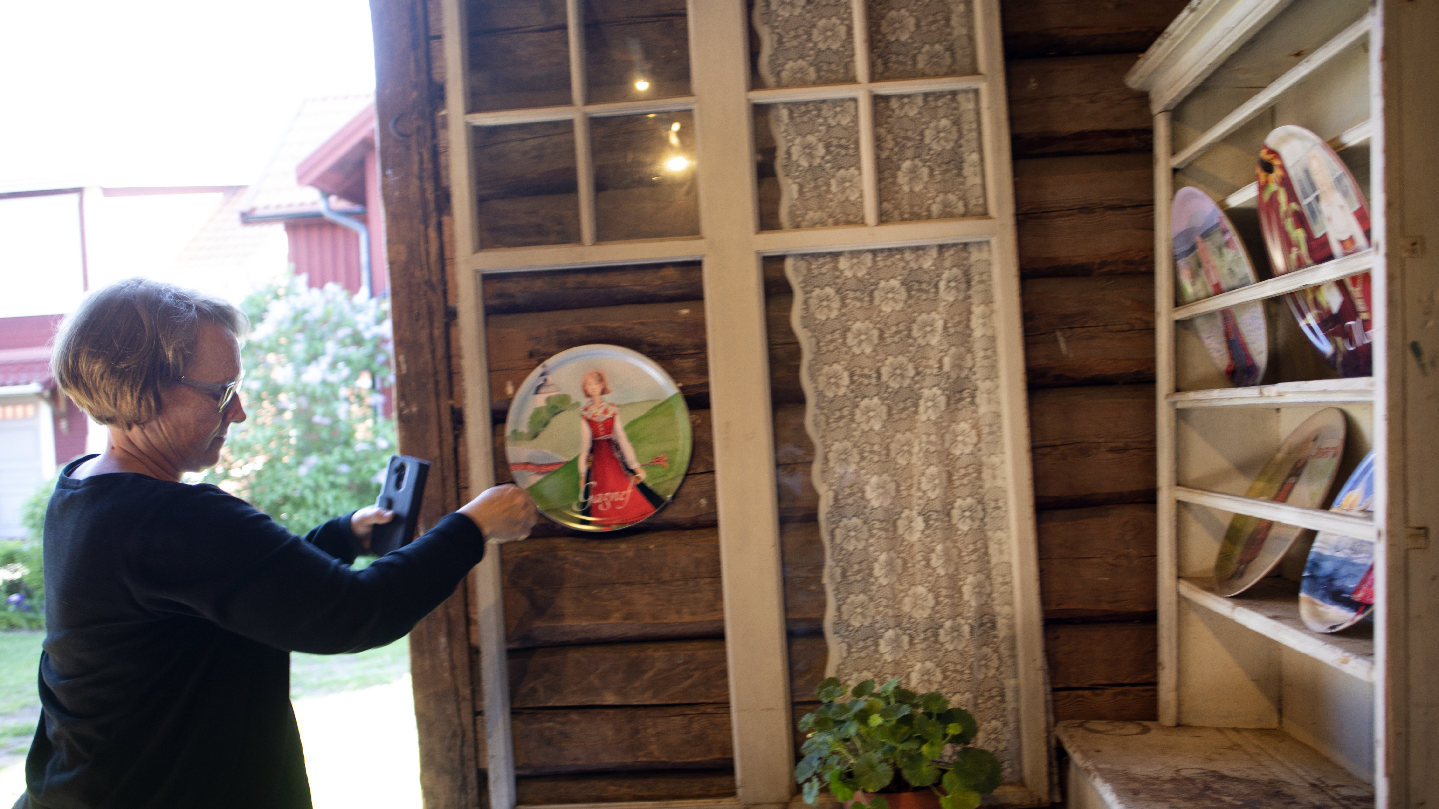 Hon går mot en av ingångarna till ladan, där står ett hundra år gammalt skåp som pryds med runda brickor. Det är Ulrikas egendesignade stora brickor. Här finns motiv ifrån Nås, Delsbo, Gagnef och Boda. Kullor klädda i dräkt i dalalandskap. Ulrikas barn är sjätte generationen på gården utanför Djurås, de liksom generationerna tillbaka, de faluröda husen och mormoderns trädgård är stora inspirationskällor till hennes skapande.