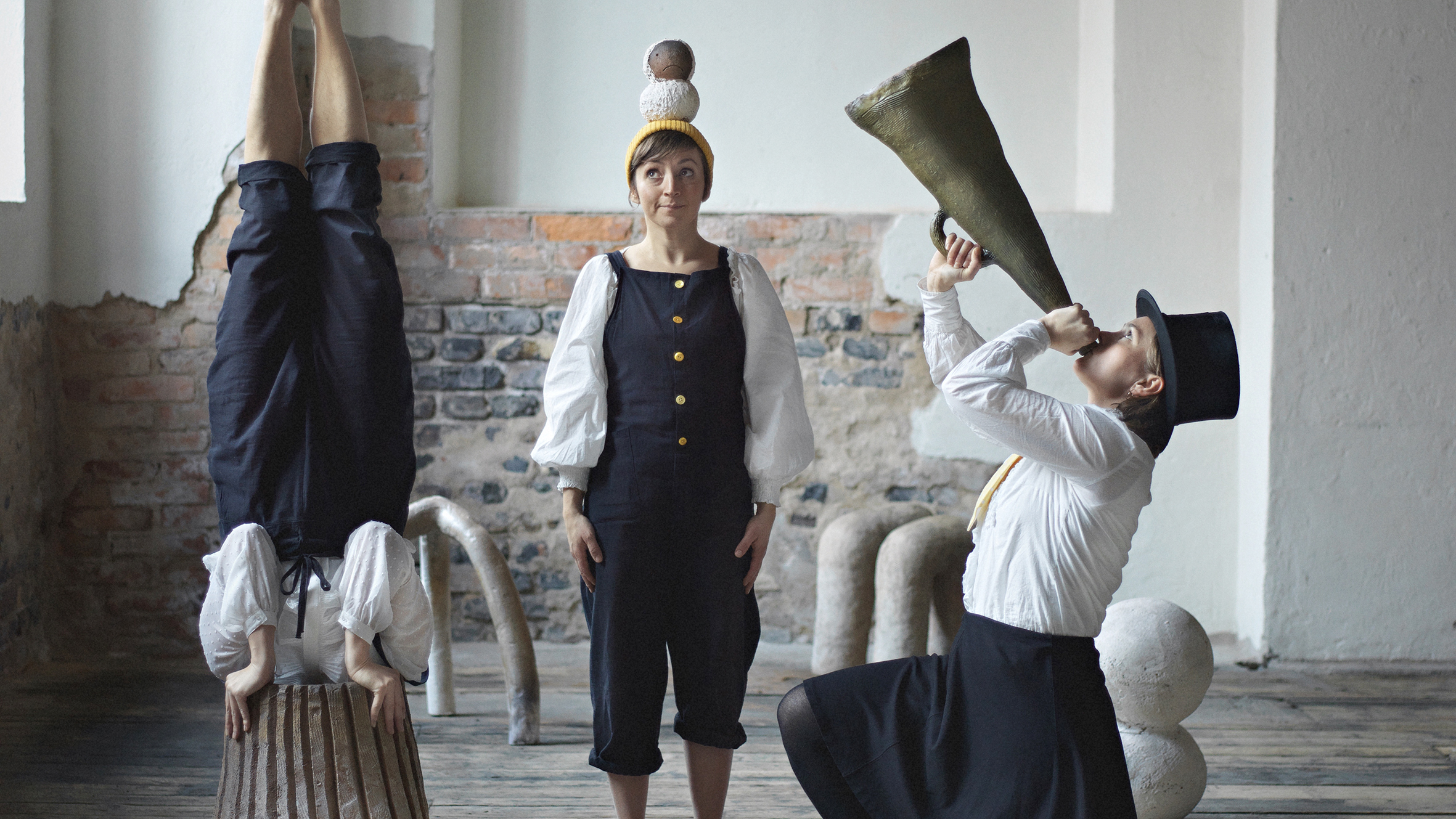 Matilda Haritz Svenson har arbetat fram en koreografi där hennes keramikskulpturer får liv. Parakrobaterna Signe Veinholt och Rebecka Nord samspelar i en levande utställningslokal.