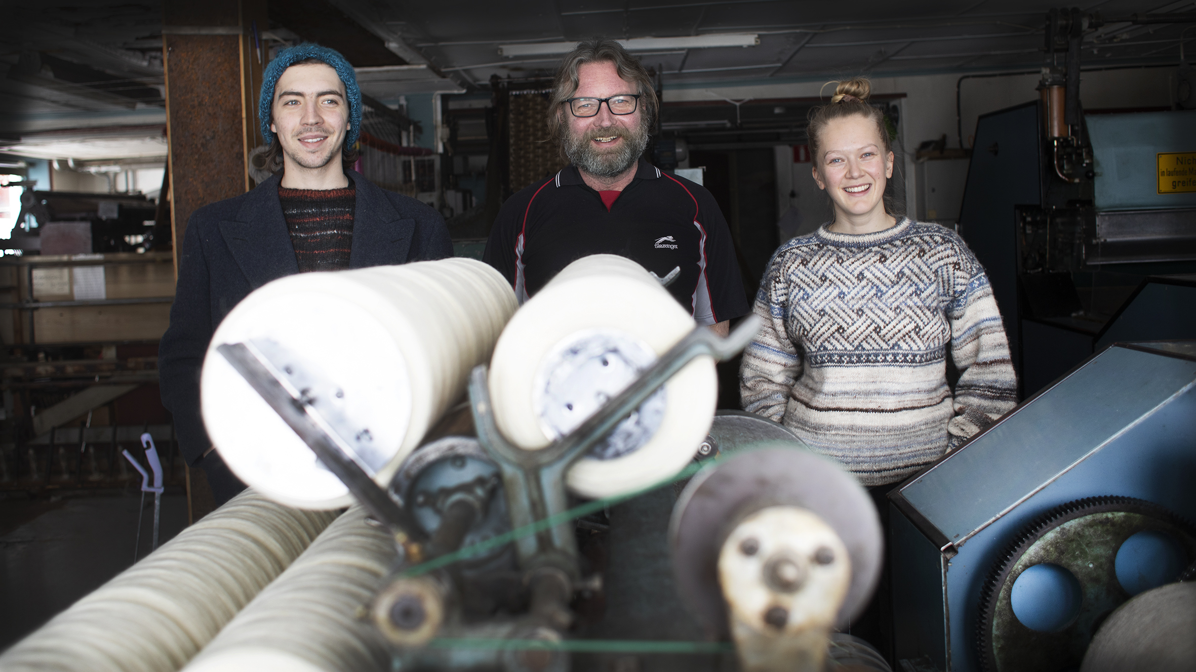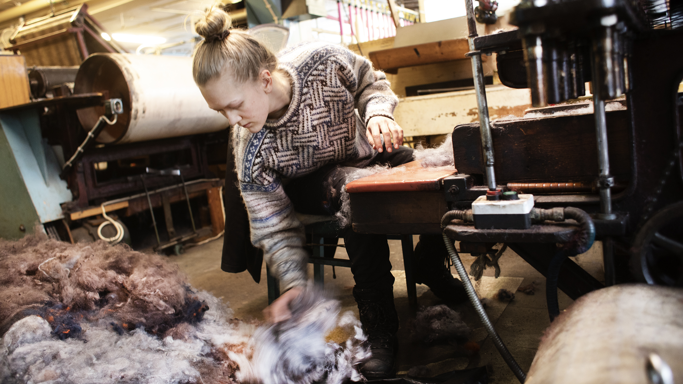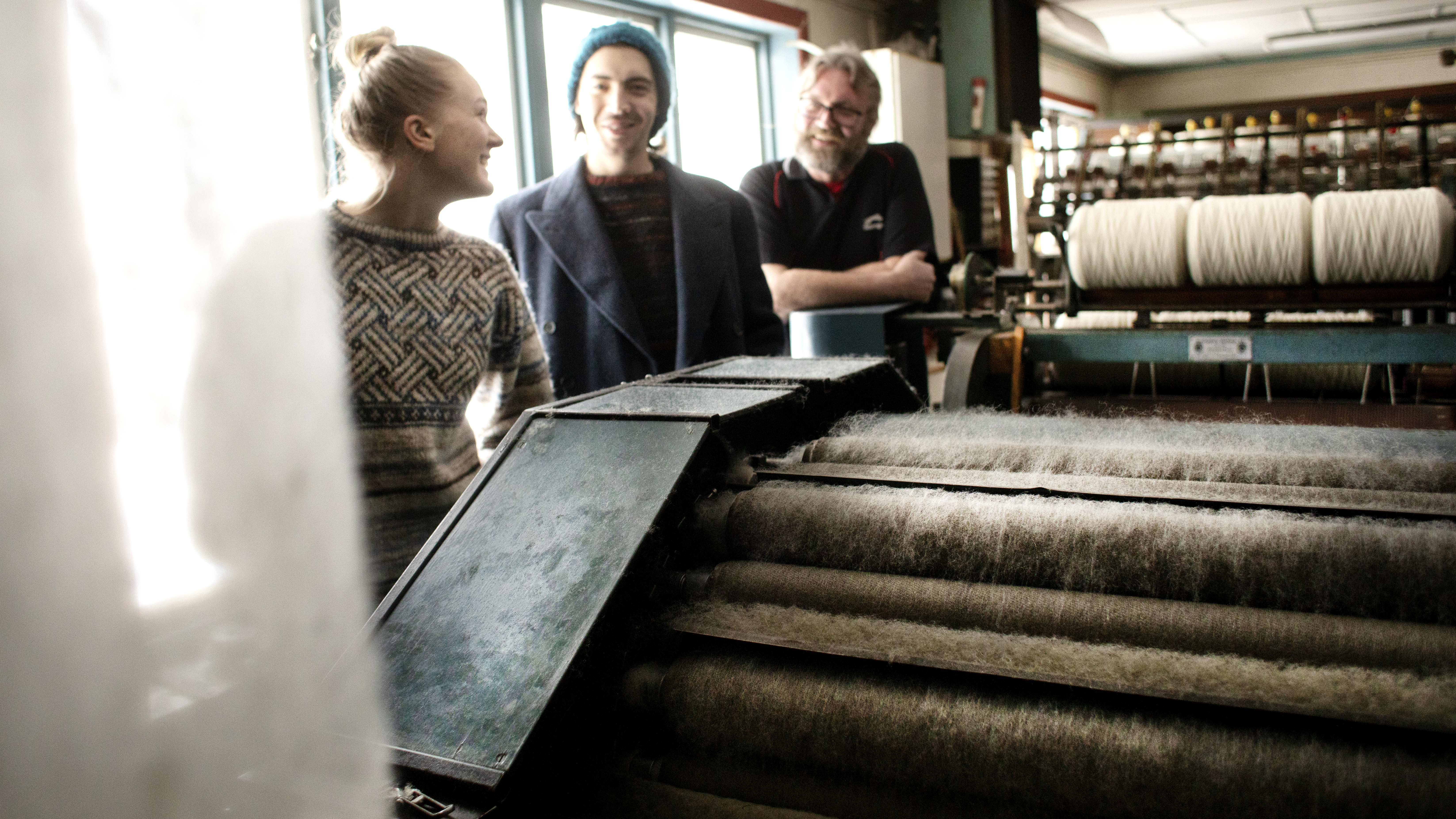 Från ett bländande snöigt vinterlandskap blir det en stor kontrast när man öppnar dörren och går in i ett av Sveriges mest kända ullspinnerier. Man välkomnas av murriga toner och en svag doft av metall och en desto fylligare doft av ull. En ny färgton har precis tagits fram, man har blandat en rödaktig nyans med svart och resultatet blev en metallaktig kulör och på stående fot bestämmer spinneritrion att garnet ska heta ”Gamla maskinen”.