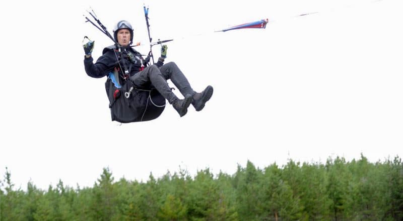 Instruktionen var att vi skulle springa bakom bilen när vajjern i skärmen sträcks. ”Hur långt?”, frågade jag. Man har varit bättre tränad, så en löptur efter en bil lät lite vanskligt. Men det blev inte många meter som jag och piloten, som sprang bredbent, behövde springa, sedan bar det iväg uppåt.