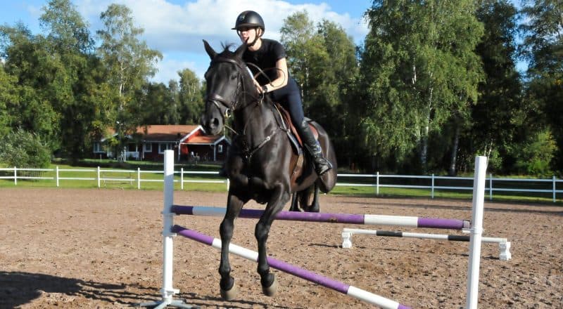 Hon säger att det inte är så svårt att skola om travhästar till hopphästar. Nuförtiden tävlar ”Piraten” för den lokala ridklubben.