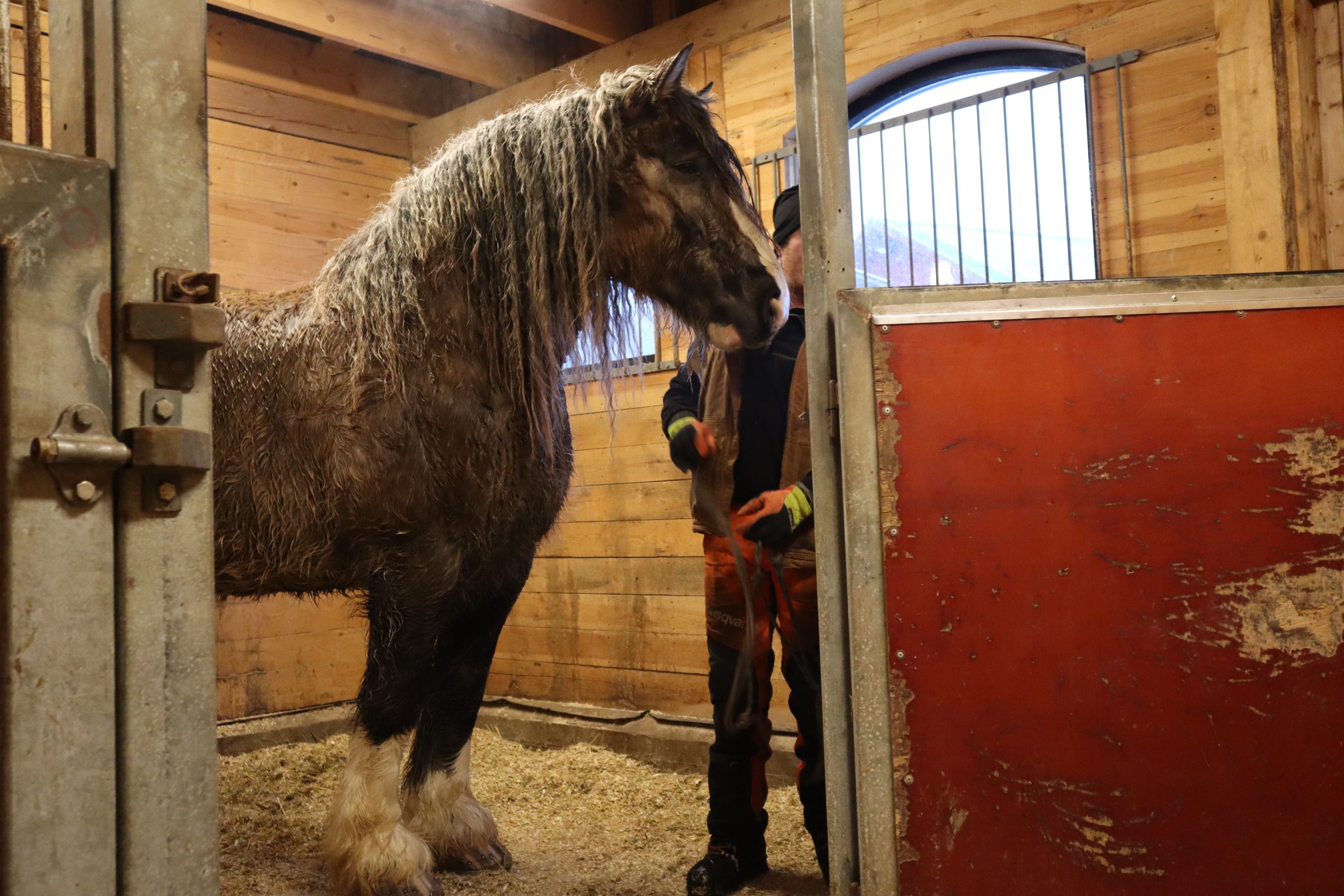Han står i stallet och ryktar bort svett och smuts från Rasmus som spenderat dagen i Borlänge tillsammans med Emil. Där har de dragit bort avverkat timmer från ett naturreservat. Rasmus har jobbat hårt och fullkomligt dryper av svett. Snart ska han få ansluta sig till sina kompisar i hagen.