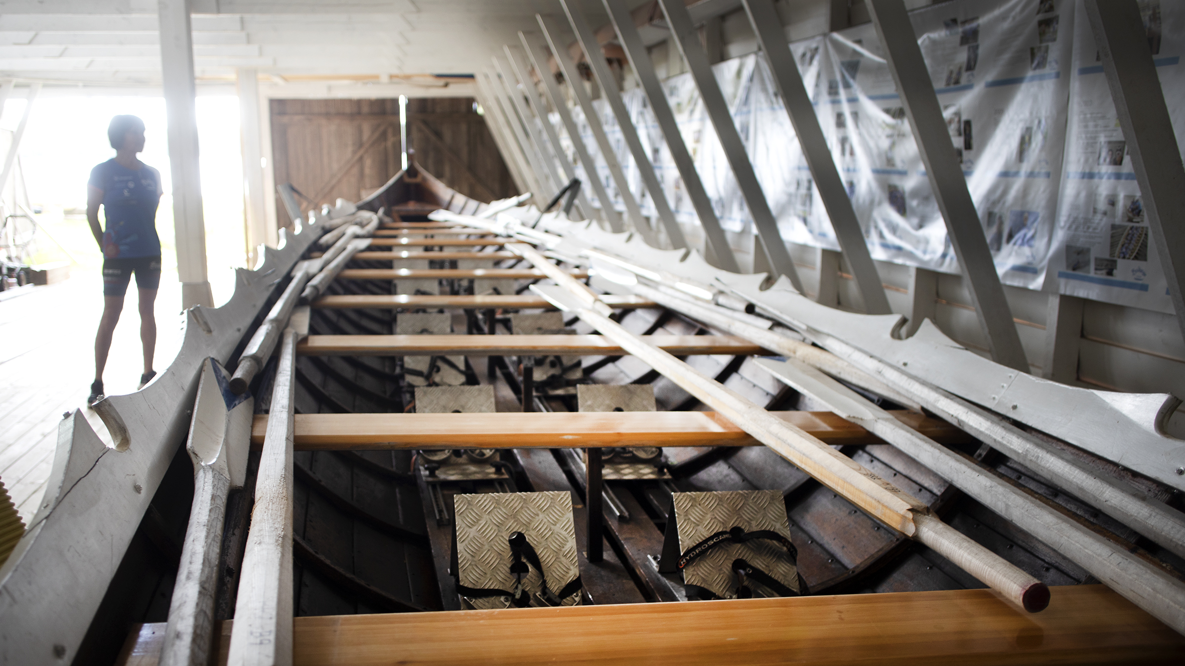 Att hon har en liten silveråra hängande i en kedja runt halsen, säger ganska mycket om Eva och hennes engagemang för rodden och klubben. Hon står utanför båthuset iklädd klubbens blåvita tävlingskläder då styrmannen Richard Brasar kommer förbi. Det är han som med stark stämma ska guida de tjugo roddarna rätt och mot vinst under finalen.
