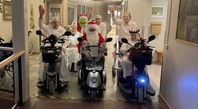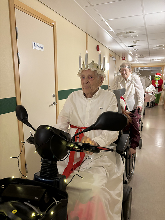 På den senaste träffen på Tallbacken fick de boende uppleva ett luciatåg utöver det vanliga. Till de klassiska luciasångerna rullade luciorna Henry och Nils in och runt på avdelningarna, följda av änglarna Gunvor och Anita tomten Lasse och stjärngossen Märta.