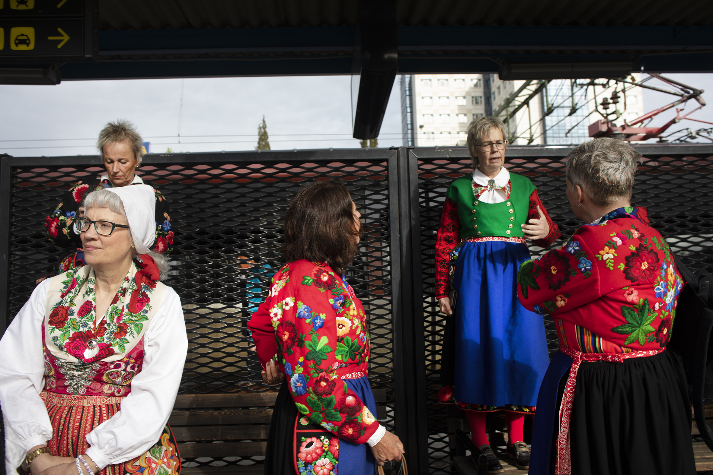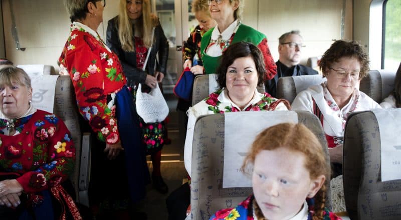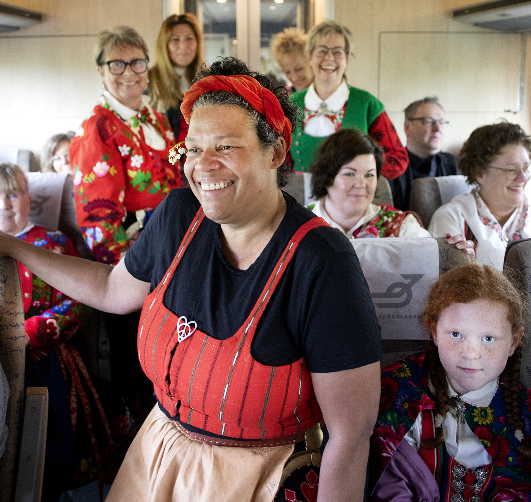 Konstnären Lotta-Maja Öhman hoppade på i Djurås. Hon har sytt ett arbetsförkläde i skinn och har fäst liljekonvaljer i den virade röda hårbandet. Hennes kläder vittnar om hur Dala-Floda dräkten gift sig med en praktisk konsthantverkare som med ett nysmitt fredshjärta-smycke pryder det röda livstycket. När Stockholmtåget är redo för avgång ifrån Sala är man hela 186 dräktklädda ombord.