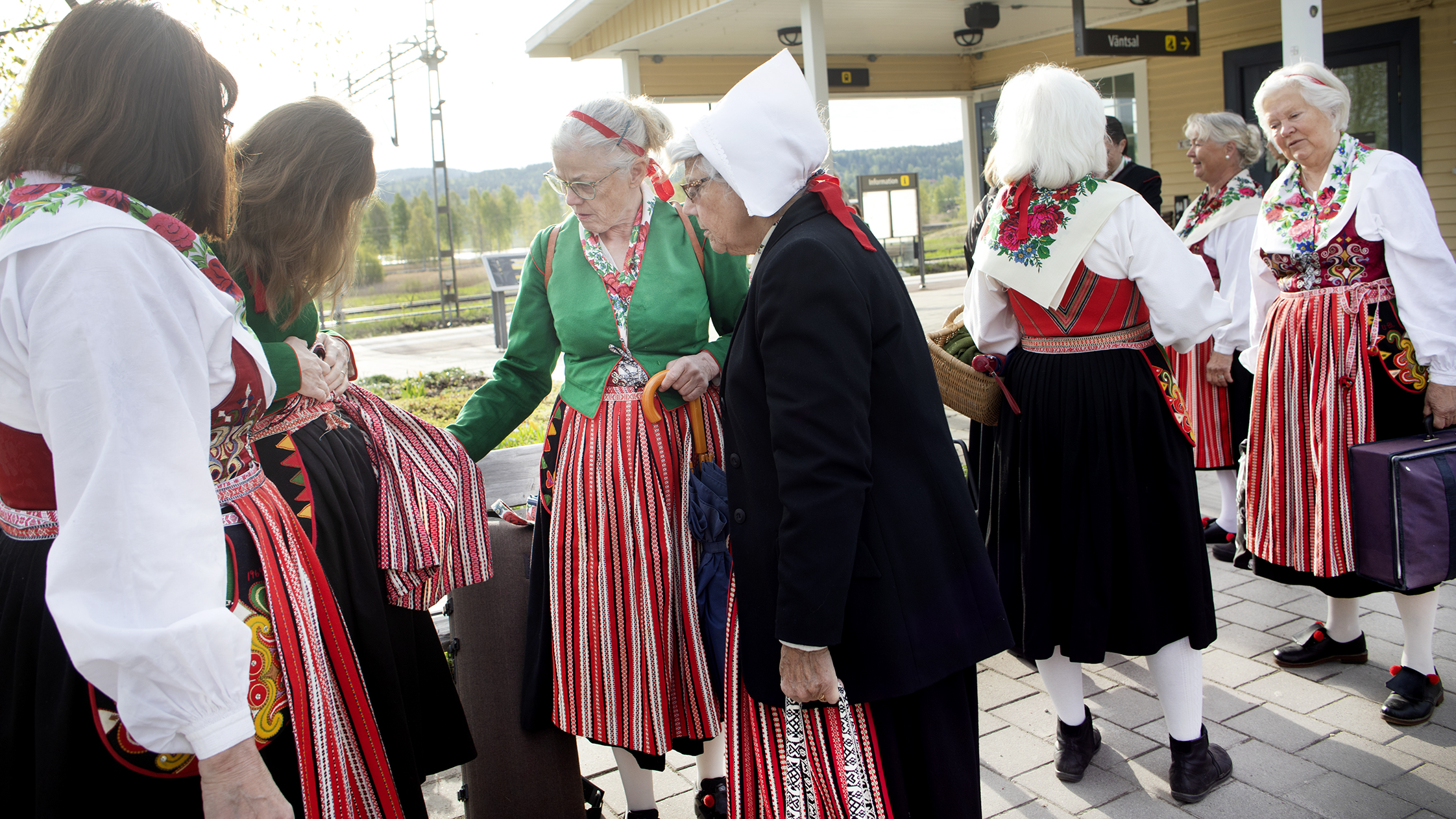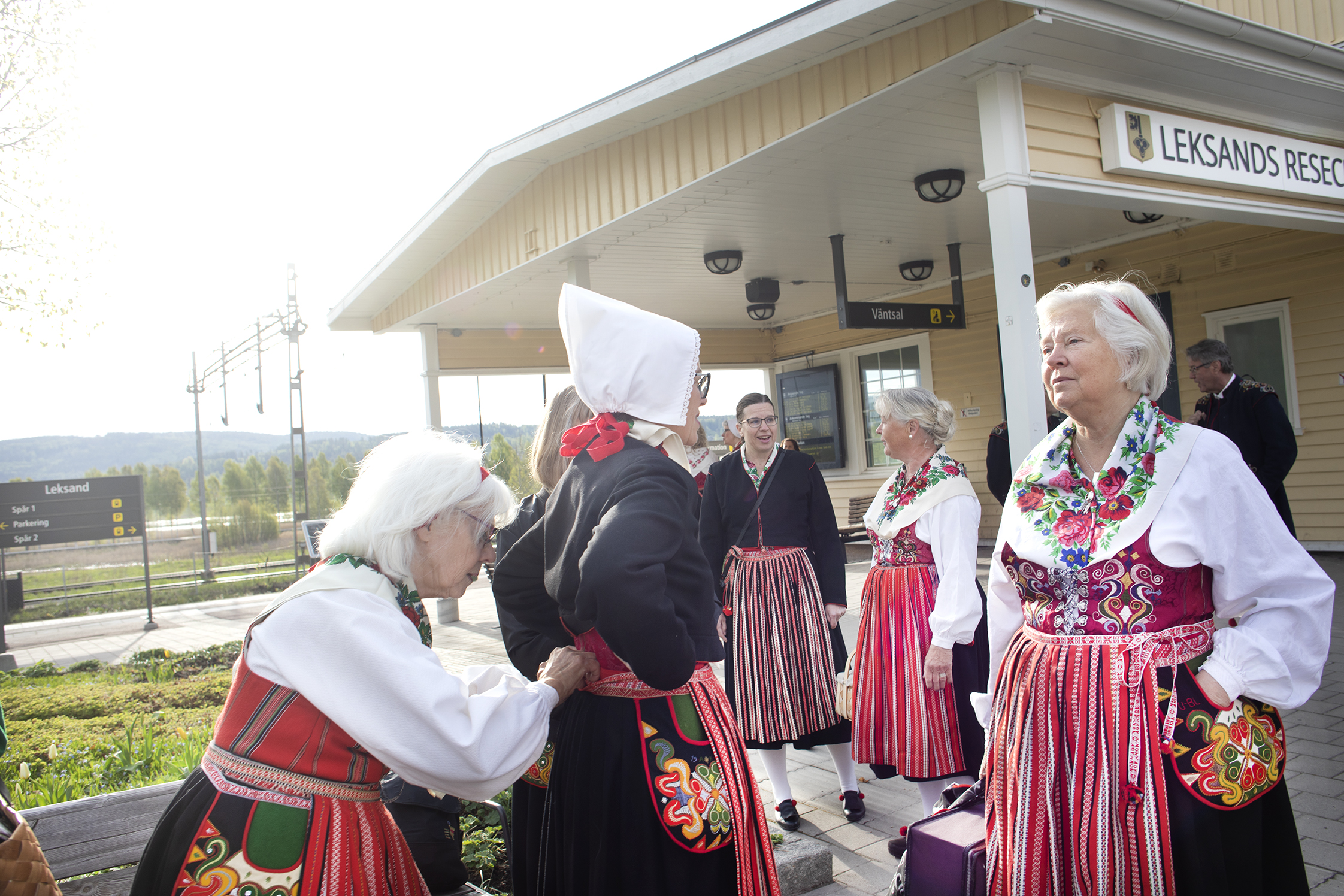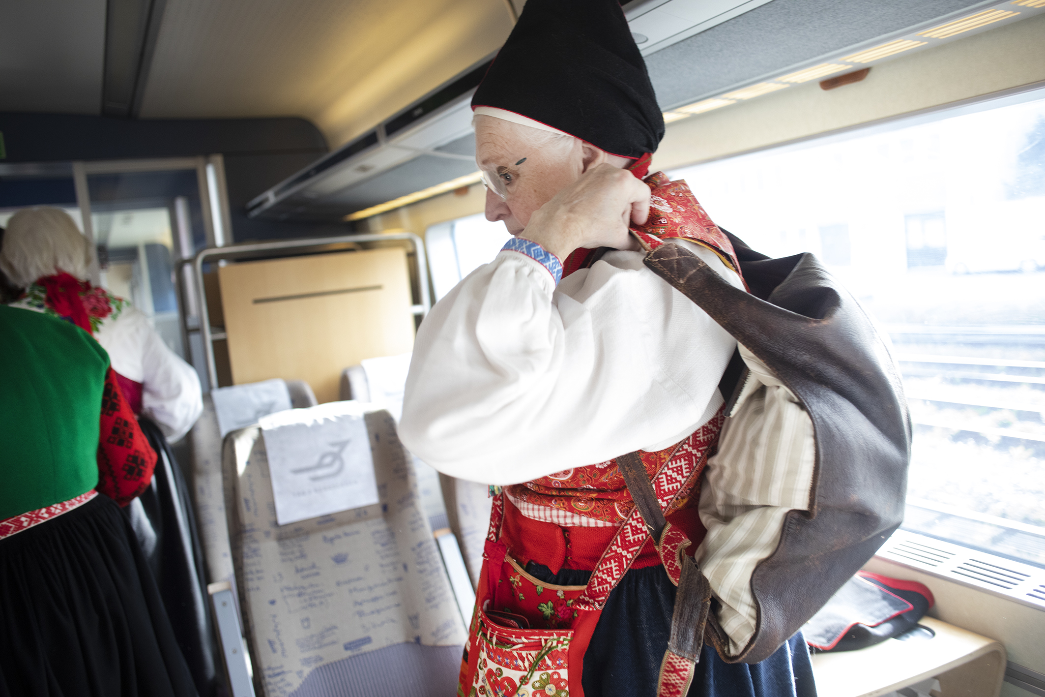Konstnären Lotta-Maja Öhman hoppade på i Djurås. Hon har sytt ett arbetsförkläde i skinn och har fäst liljekonvaljer i den virade röda hårbandet. Hennes kläder vittnar om hur Dala-Floda dräkten gift sig med en praktisk konsthantverkare som med ett nysmitt fredshjärta-smycke pryder det röda livstycket. När Stockholmtåget är redo för avgång ifrån Sala är man hela 186 dräktklädda ombord.