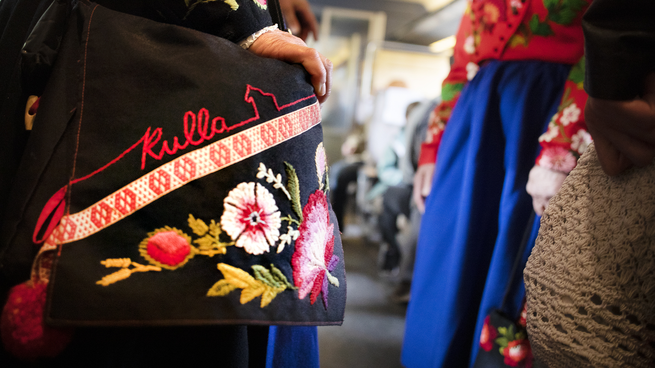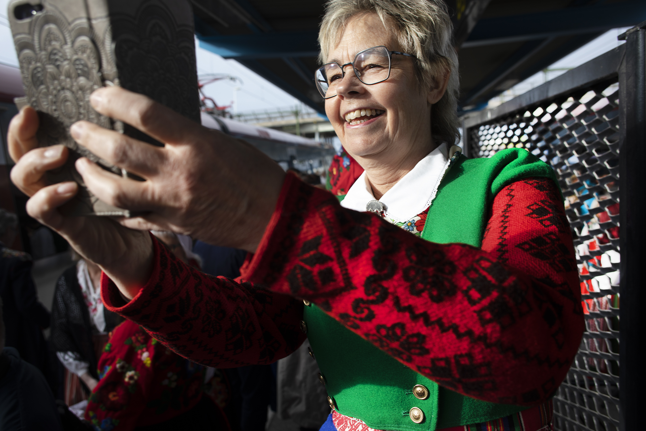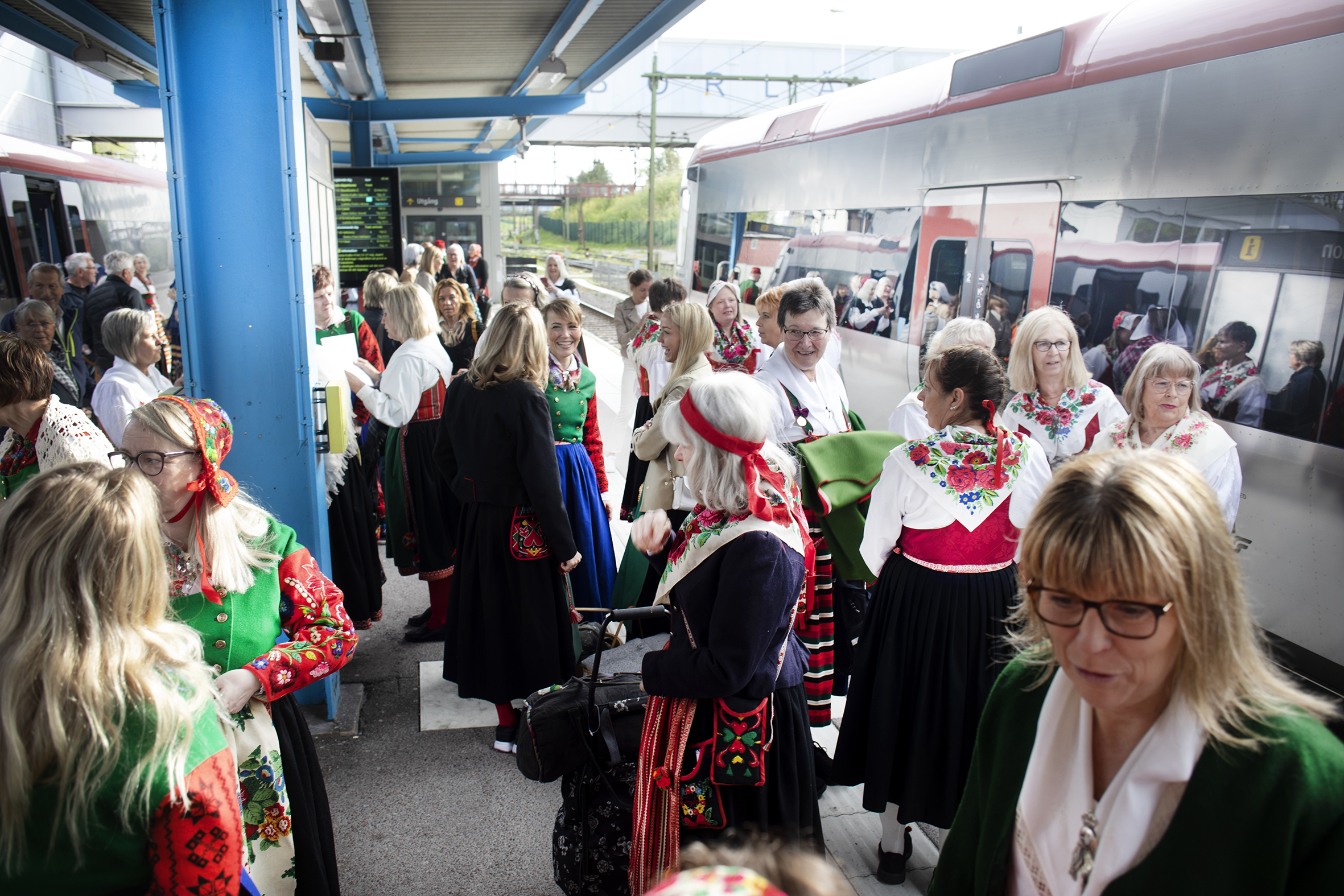 Konstnären Lotta-Maja Öhman hoppade på i Djurås. Hon har sytt ett arbetsförkläde i skinn och har fäst liljekonvaljer i den virade röda hårbandet. Hennes kläder vittnar om hur Dala-Floda dräkten gift sig med en praktisk konsthantverkare som med ett nysmitt fredshjärta-smycke pryder det röda livstycket. När Stockholmtåget är redo för avgång ifrån Sala är man hela 186 dräktklädda ombord.