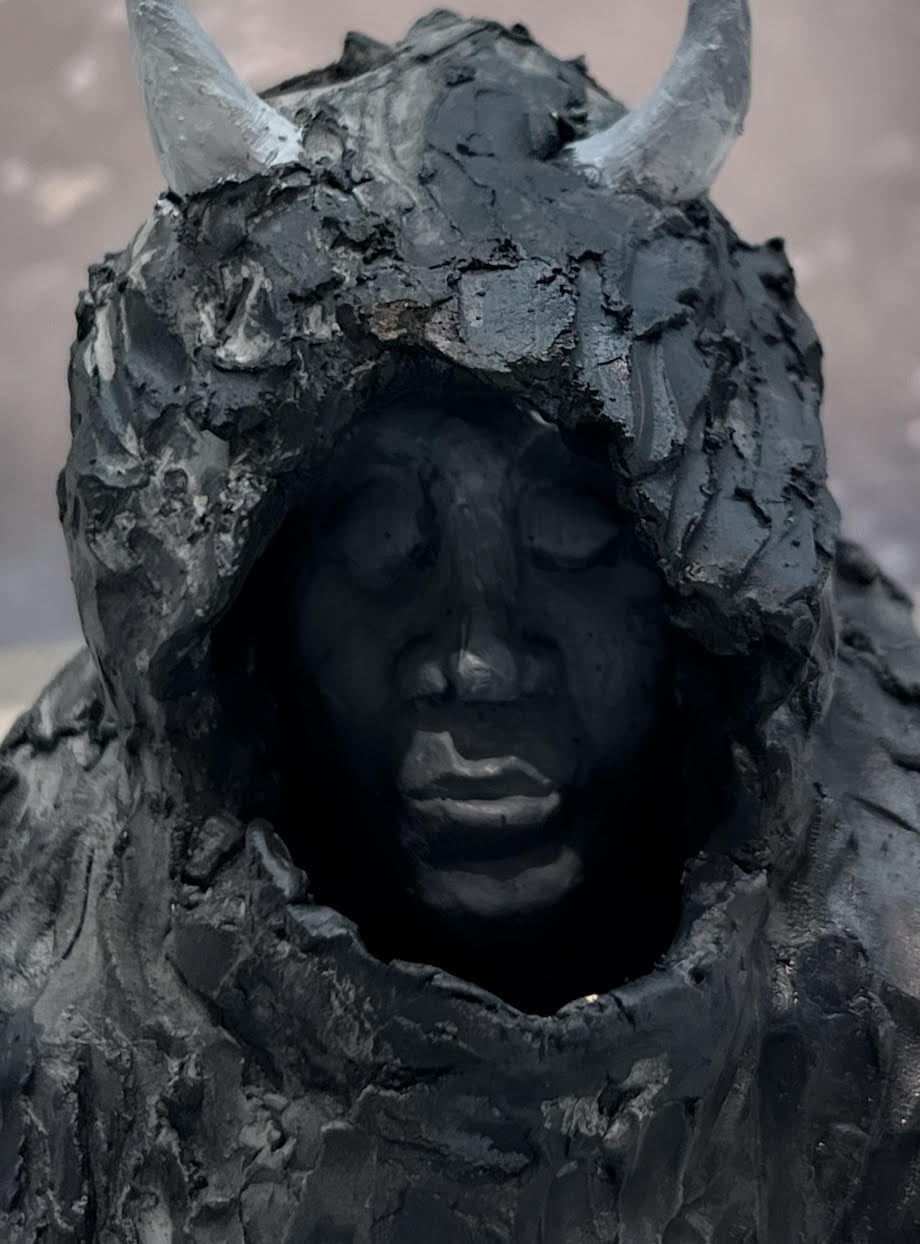 På utställningen i Rättvik visar Juhl sex olika keramiska figurer – var och en med sin egen bakgrund och personlighet. En av dem heter Malum, en mörk gestalt med horn, skapad under en period då Alexander vaknade varje natt vid samma tid.