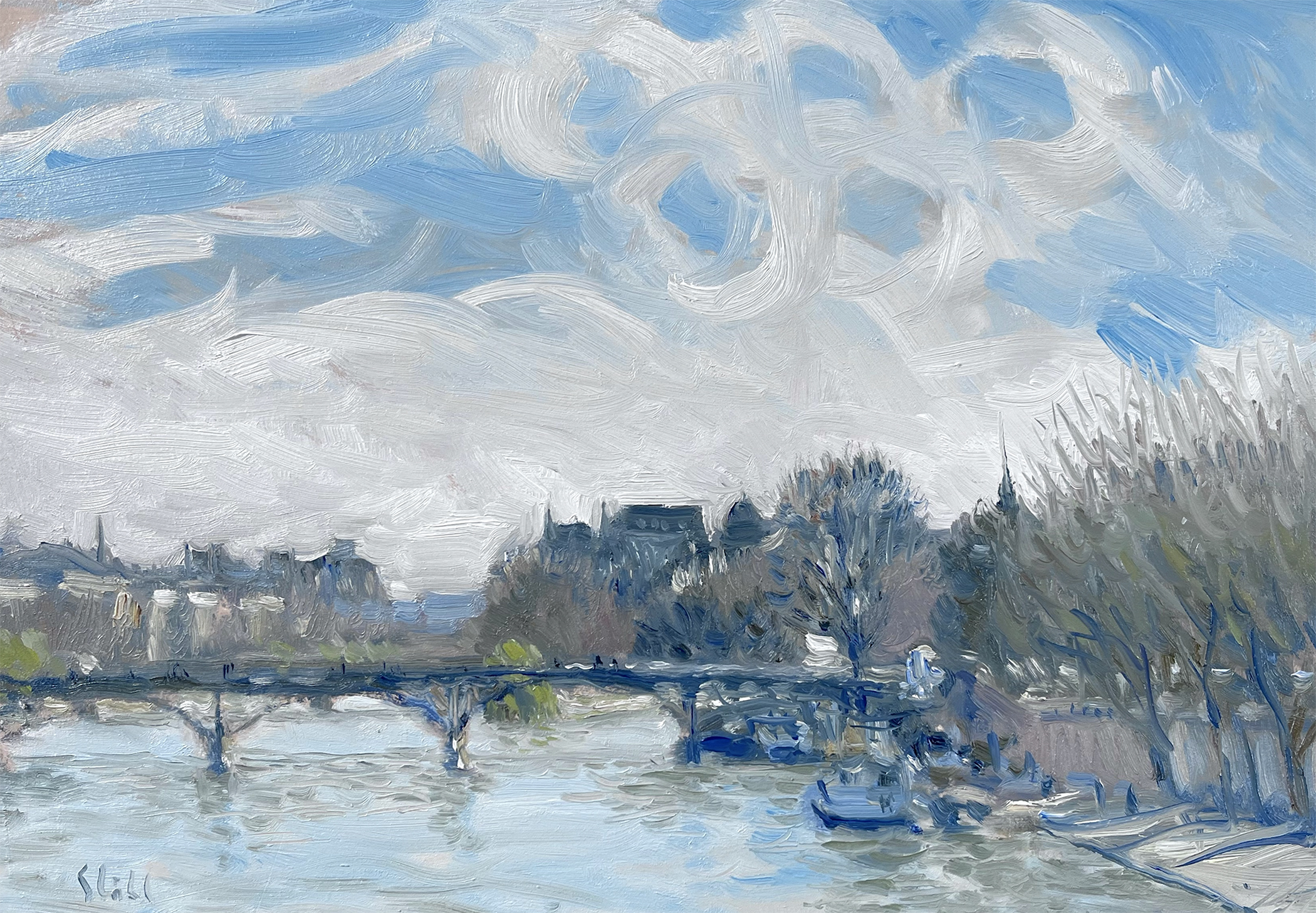 — Men redan nu är jag även representerad med en målning på deras vårsalong som i år har OS-tema. ”I andan av de Olympiska spelen” heter utställningen och min målning är ett Parismotiv där man kan skönja OS-ringarna bland molnen, säger han och visar en bild.