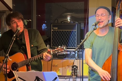 — Det vore kul om man kunde haft en trummis med, men det fick inte plats, konstaterar Peter med ett skratt. Men har man ingen trummis, så är en kontrabas perfekt att ha med sig. Jag driver lite olika projekt och nu hade jag Andreas Nordell med mig.