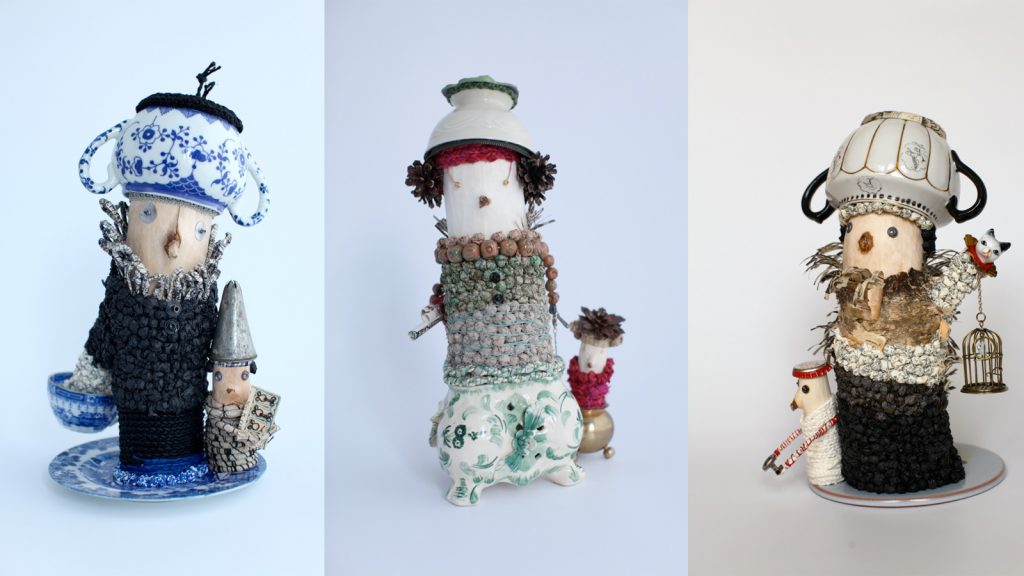 Så för betraktaren kanske det känns ovant att vissa alster över huvud taget kan kallas för slöjd. Det finns tavlor som är gjorda i trä, Elin Larssons täljda fåglar i trä eller Maria Högberg med sina skulpturer där hon använder ett vedträ som bas för att sedan kreera i olika former.