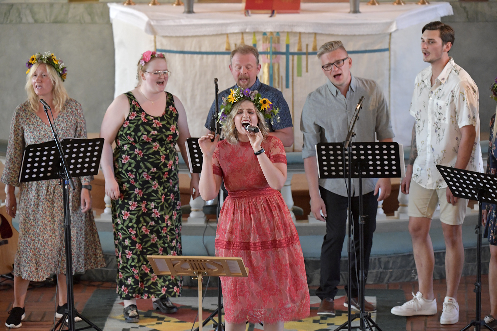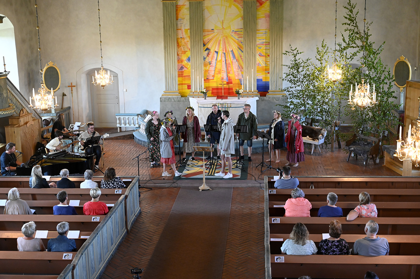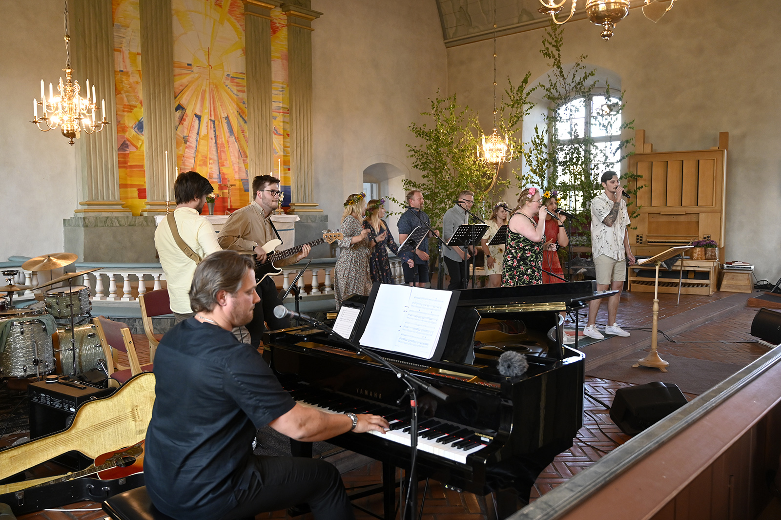 Sommarkonsert Våmhus kyrka med från vänster: Vid flygeln: Ludwig Fontanac Rytter, Gitarr: Jonas Björk, Bas: Ludvig Gawell och Trummor: Leo Kinell. Körsångarna är från vänster: Jennifer Höglund, Johanna Hed, Anna Hed, Johan Hed, Anders Holm, Håll Emelie Hallvars Holm och Anna Björk. Längst fram Linnéa Hed och Erik Eklund. Foto Nisse Schmidt