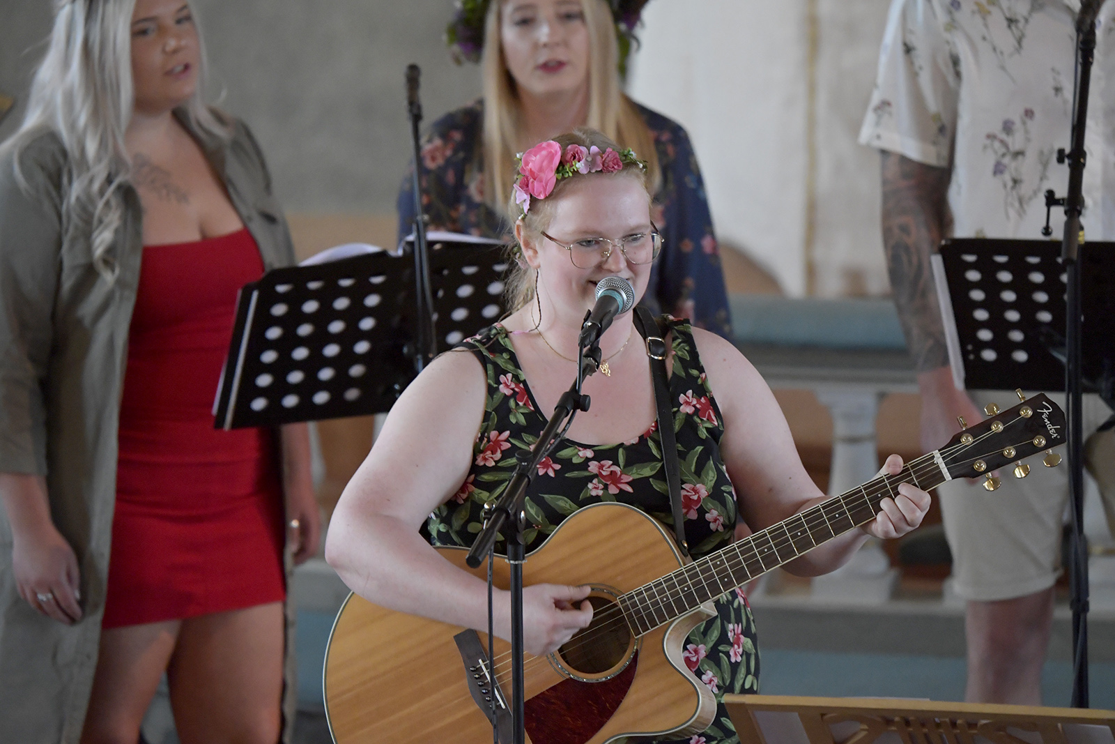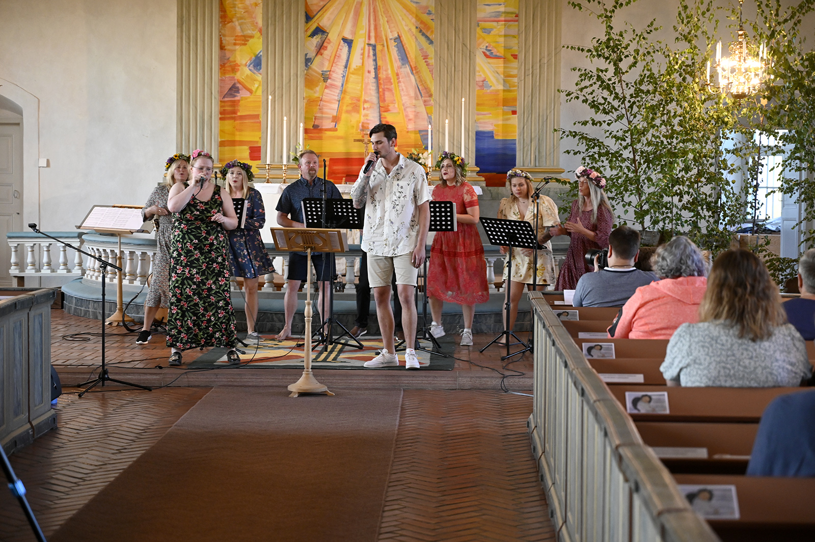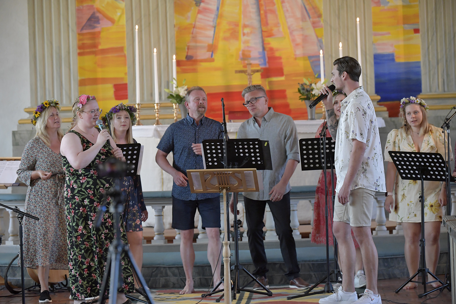 Sommarkonsert Våmhus kyrka med från vänster: Vid flygeln: Ludwig Fontanac Rytter, Gitarr: Jonas Björk, Bas: Ludvig Gawell och Trummor: Leo Kinell. Körsångarna är från vänster: Jennifer Höglund, Johanna Hed, Anna Hed, Johan Hed, Anders Holm, Håll Emelie Hallvars Holm och Anna Björk. Längst fram Linnéa Hed och Erik Eklund. Foto Nisse Schmidt