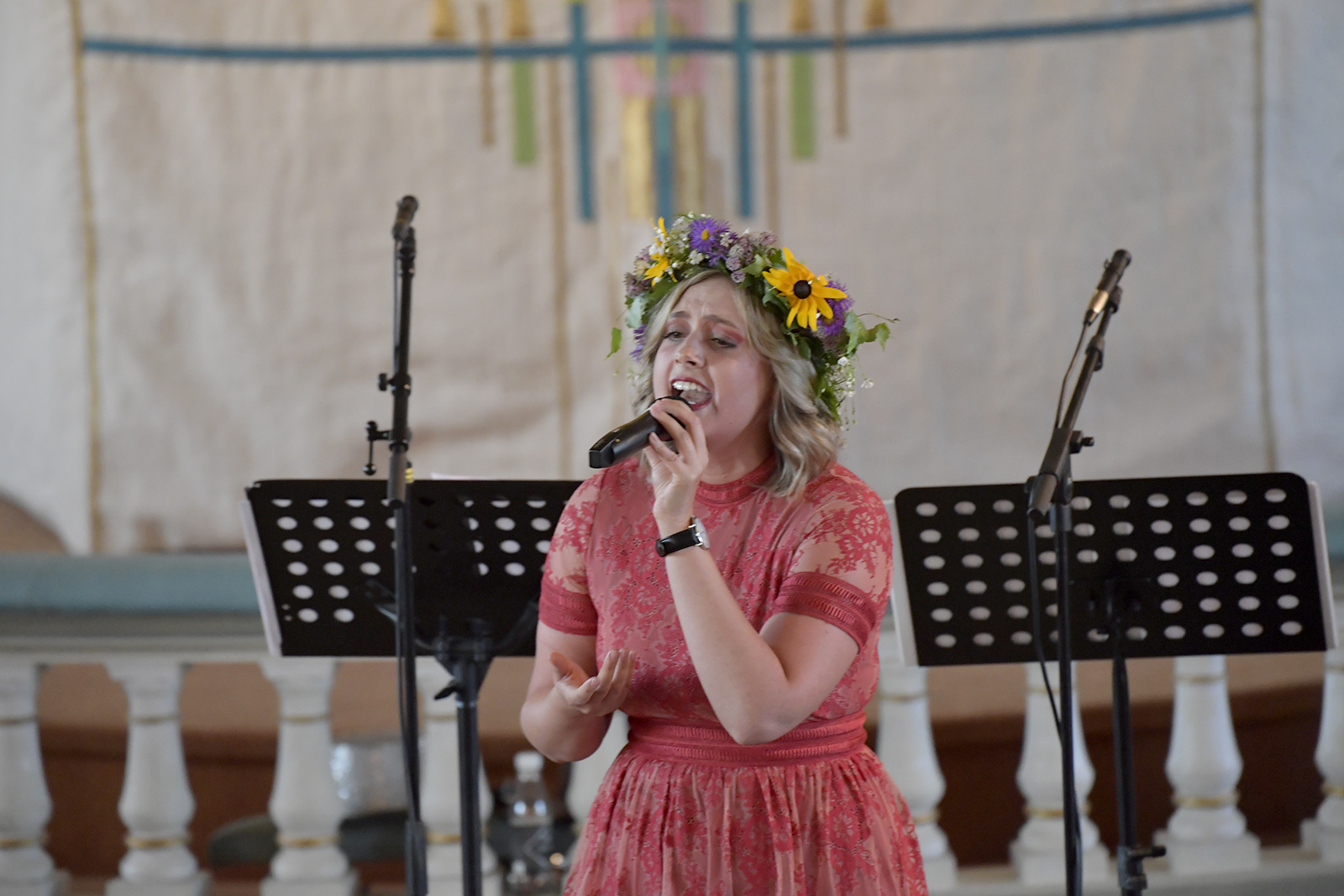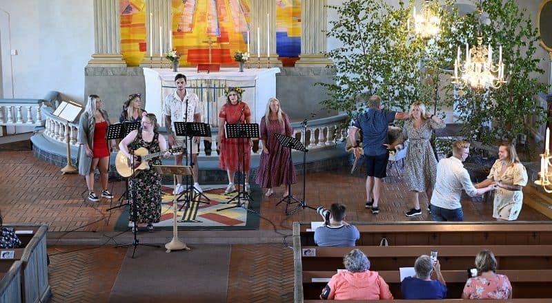 Jennifer Höglund drar upp tempot med Var ska vi sova inatt med spontandans i kyrkan. Foto Nisse Schmidt