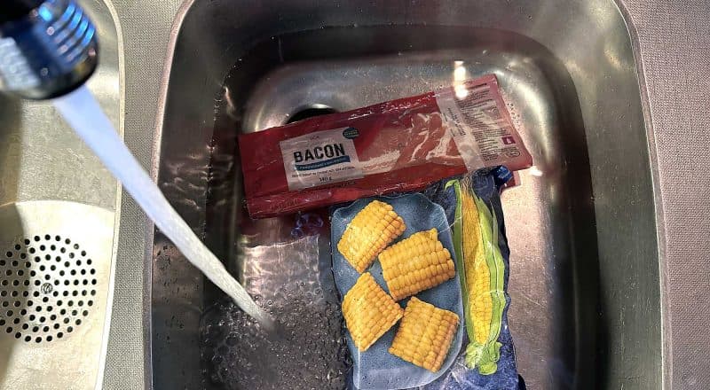 – Ja, speciellt avancerat är det knappast. Man bara fyller diskon med lite ljummet vatten och lägger i det som ska tinas. Ligger det inte redan i en vattentät påse från butiken, så får man leta fram en sådan och täta öppningen med en klämma eller knut.