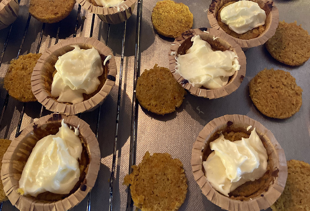 Hon använder sitt bästa recept på morotskaka, men i stället för långpanna häller hon smeten i muffinsformar. När de svalnat skär hon av toppen, klickar på glasyr och lägger tillbaka locket.