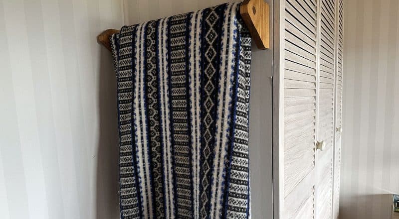 — Vi har alltid haft hundar och i vårt sovrum fanns ingen bra plats att lägga överkastet på kvällen. Därför byggde jag den här hållaren. Det är säkert 25 år sedan nu – och den används fortfarande varje kväll. Urenkelt men bra, tycker jag.