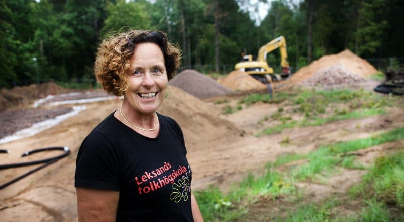 Rektorn på Leksands folkhögskola Anki Gullback står i duggregnet och blickar ut över byggarbetsplatsen. Två markarbetare jobbar med rör i sandgropen och en grävmaskinist har schaktat ut sand. Det är bakom keramikverkstaden på Leksands folkhögskola som de nya bostäderna nu tar form.