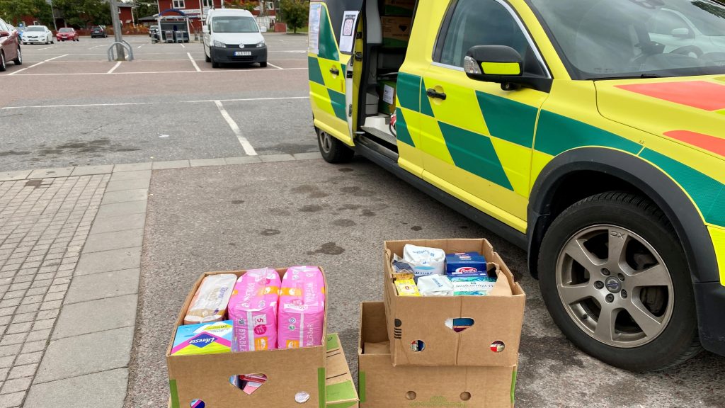 På måndagen i Insjön stod ambulansen parkerad utanför entrén till Hemköp där kunder i parti och minut kom ut från affären och lämnade ett bidrag i form av konserver, ris, pasta eller blöjor för att nämna några exempel. Via ett swishnummer kunde man dessutom skänka pengar samt att många valt att skänka kläder.