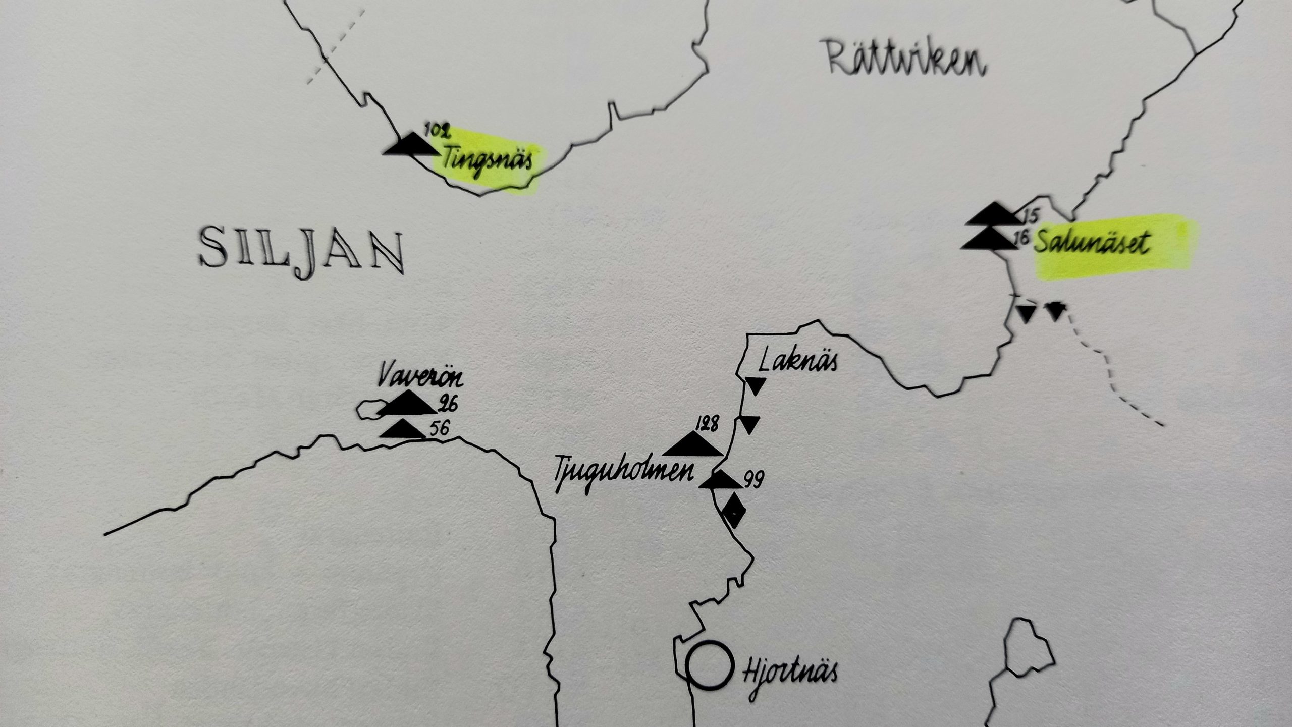 Sedan har vi Tingsnäs udde i Mora. Men som ni ser på bilden finns det också ett Tingsnäs på en udde som tillhör Leksand. Hur hänger det här ihop? Ting var förr sammankomster för behandling av gemensamma frågor med dömande inslag. Men hörde dessa tingsplatser ihop på något sätt? Rösen lär ska finnas kvar med stenskepp. Vad var nu detta? Jo, stenskeppen var ett slags kollektiva gravminnen över bygdehövdingafamiljer, klanmedlemmar som också hade hand om metalltillverkning, kontakter, religion, logistik och handel. Och då tänker jag så här. Tingsnäs i Mora och i Leksand kan ha varit ett centrum för hela Siljansbygdens kult, domstol och handel. Ett slags konsortium tusentals år före Clas Ohlson och kompani.