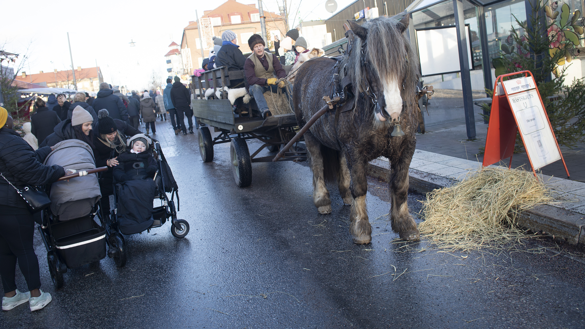 Julmarknaden på Noret lockade stora som små, med inslag av saffransbullar, pepparkakor och munkar fanns även åkturer med Grabb Emil Sund från Djurås by och hans arbetshäst. Sedan öppningen vid lunchtid var vagnen full av besökare som ville njuta av ett klassiskt hästekipage.